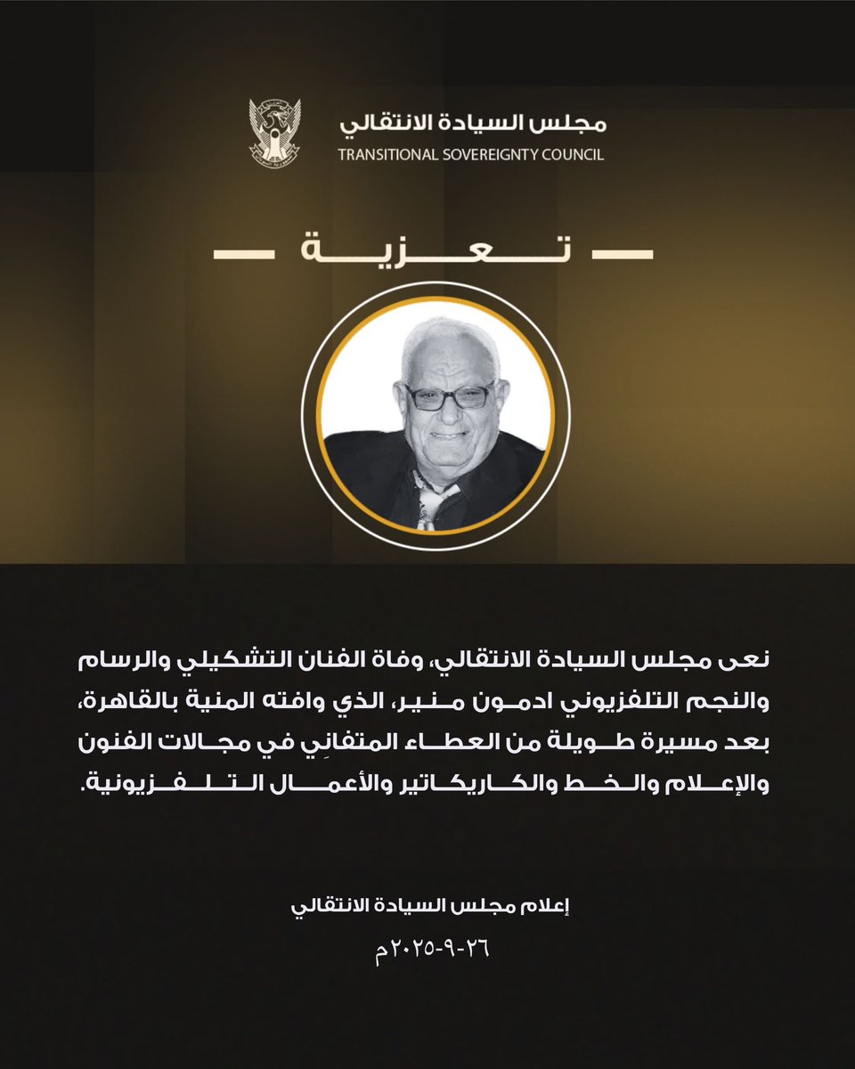 مجلس السيادة مجلس السيادة ينعى الفنان التشكيلي والرسام ادمون منير … By null Published October 16, 2025 Share SHARE Facebook Twitter Pinterest LinkedIn ⭕️ مجلس السيادة ينعى الفنان التشكيلي والرسام ادمون منير Source by مجلس السيادة الإنتقالي – السودان Facebook Twitter Pinterest LinkedIn Share This Article Facebook Twitter Email Print Previous Article MEET SAN FRANCISCO RADICAL KAMALA HARRIS! … Next Article دعوة خاصة للمحس و الكنوز و الدناقلة . … Leave a Comment Leave a Reply Cancel replyYour email address will not be published. Required fields are marked *Comment * Name * Email * Website Save my name, email, and website in this browser for the next time I comment. Δ SearchSearchRecent Postsما حقيقة الادعاء بأن تشاد أغلقت سفارتها في تل أبيب ونقلت الملف إلى سفارتها بأبوظ… مسبار ألمانيا | شهدت مظاهرة مؤيدة لفلسطين في ميدان ألكسندر بلاتس بالعاصمة برل… التقيت اليوم بممثلي المرأة في حركة تحرير السودان بالفاشر تناول اللقاء قضايا المر… ظللنا منذ بداية الحرب بشكل متسق ندين كل انتهاكات طرفي الحرب الدعم السريع والقوات… ما هي الفئات المحظورة من الانتماء إلى حزب بناء #السودان ما هي شروط العضوية في #… Recent CommentsNo comments to show.