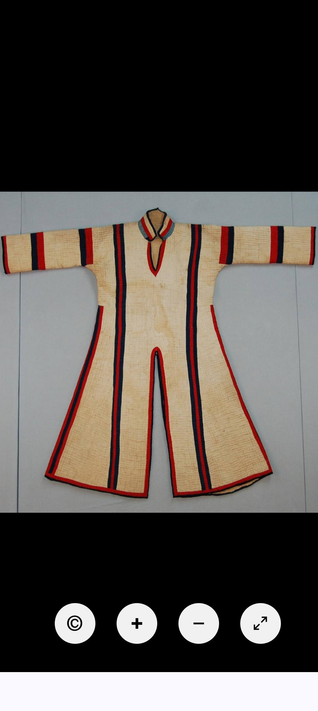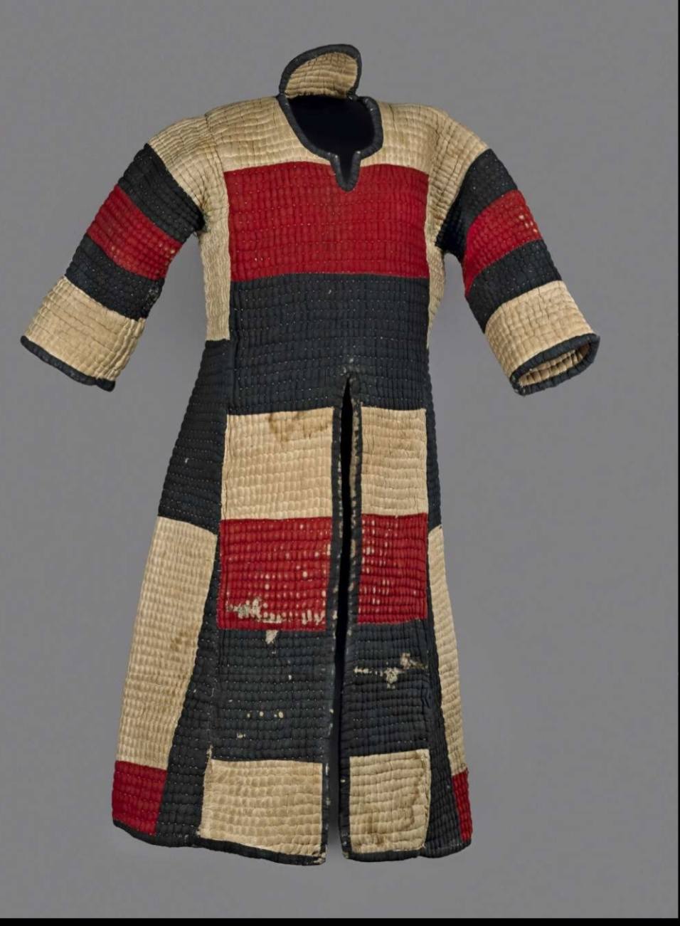 هذه الجبّة باللون الأخضر، رقمها في سجلات المتحف Af1979,01.5089، نسجت من القطن السوداني، وزُيّنت بقطع صوفية مخيطة بإتقان على القماش، مع تطريزات دقيقة حول الحواف وجيب الصدر، وبعض الصور أزياء للنساء وكذلك دروع عسكرية، ما يميزها هو تناسق الألون والجودة.