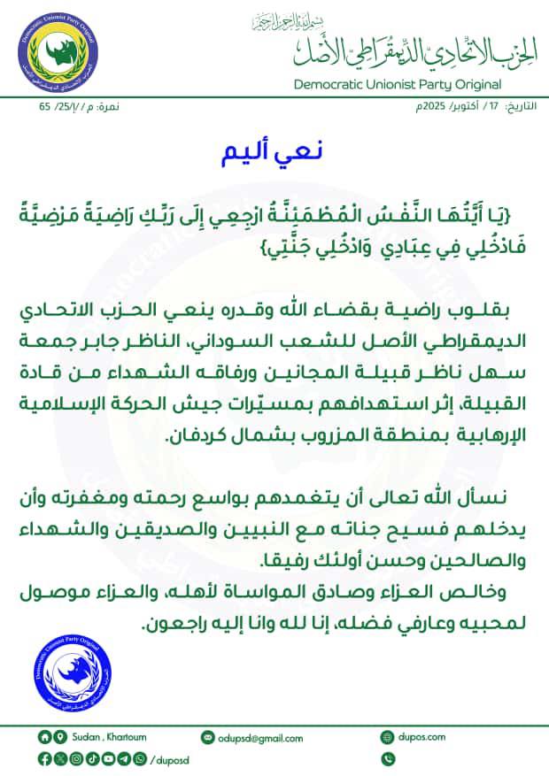 بقلوب راضية بقضاء الله وقدره ينعي الحزب الاتحادي الديمقراطي الأصل للشعب السوداني، الناظر سليمان جابر جمعة سهل ناظر قبيلة المجانين ورفاقه الشهداء من قادة القبيلة، إثر استهدافهم بمسيّرات جيش الحركة الإسلامية الإرهابية بمنطقة المزروب بشمال كردفان.