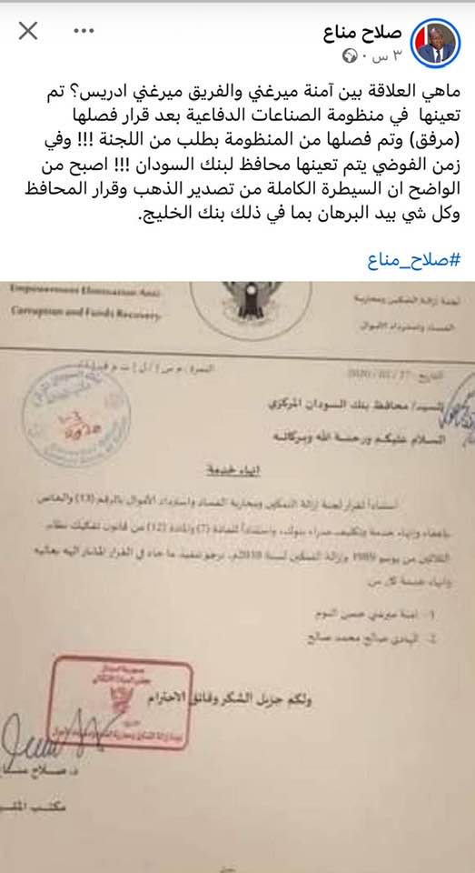 * والتخليط يبدأ عندما يربط بين اسمها وبين اسم الفريق ميرغني ادريس ، ويظهر الأمر وكأنما تشابه الأسماء ينهض حجة للقرابة ! .. الجدير ذكره أن آمنة ميرغني فصلت من منظومة الصناعات الدفاعية بعد ثلاثة أيام فقط ما يعني انتفاء أي علاقة بينها وبين ميرغني ادريس .