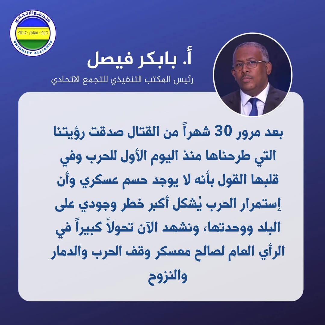 _ بعد مرور 30 شهراً من القتال صدقت رؤيتنا التي طرحناها منذ اليوم الأول للحرب وفي قلبها القول بأنه لا يوجد حسم عسكري وأن إستمرار الحرب يُشكل أكبر خطر وجودي على البلد ووحدتها, ونشهد الآن تحولاً كبيراً في الرأي العام لصالح معسكر وقف الحرب والدمار والنزوح.