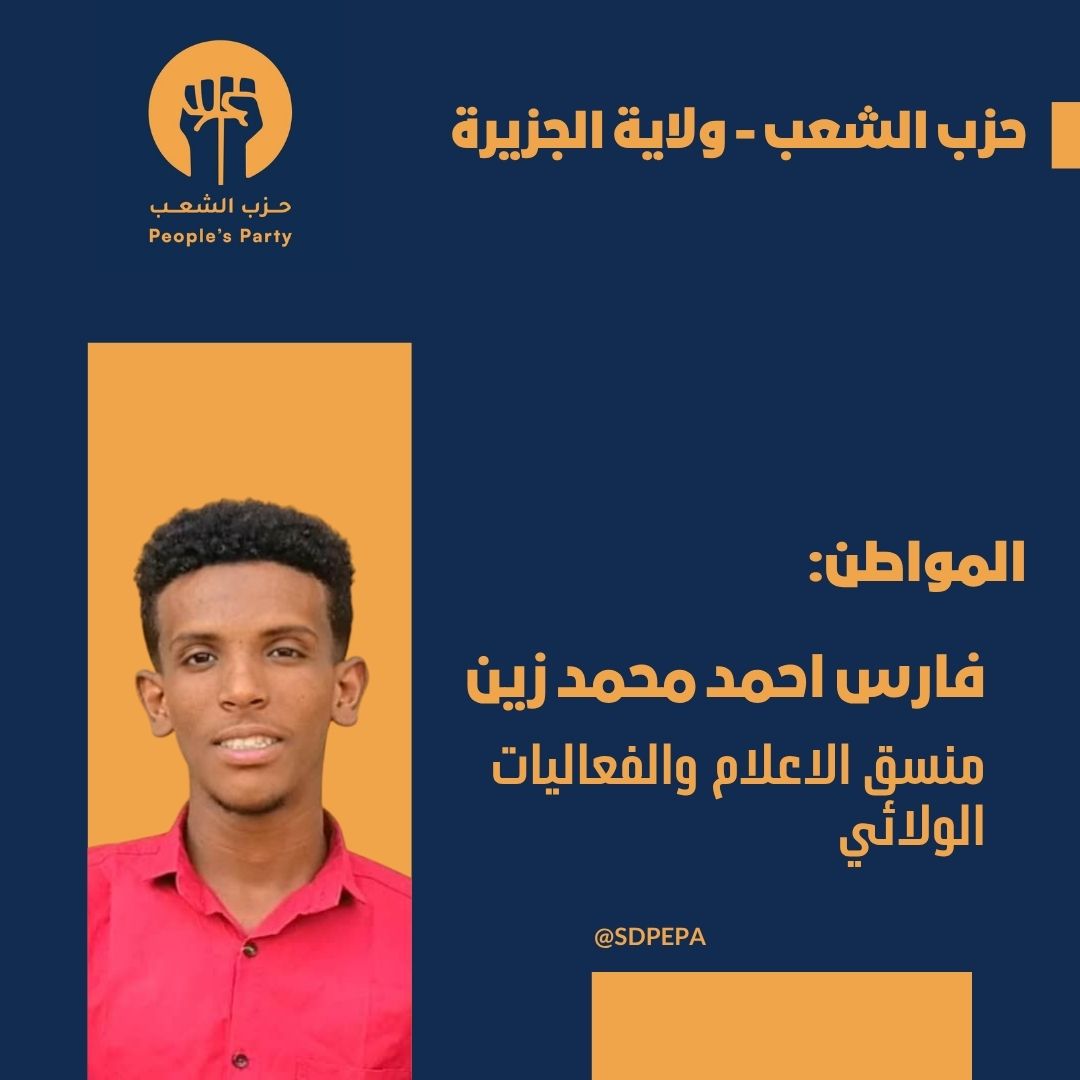 اصدر المواطن عمر التوم رئيس مكتب الحزب بولاية الجزيرة قرارا بتكليف المواطن فارس احمد محمد زين مسؤولا لملف الاعلام والفعاليات الولائي.