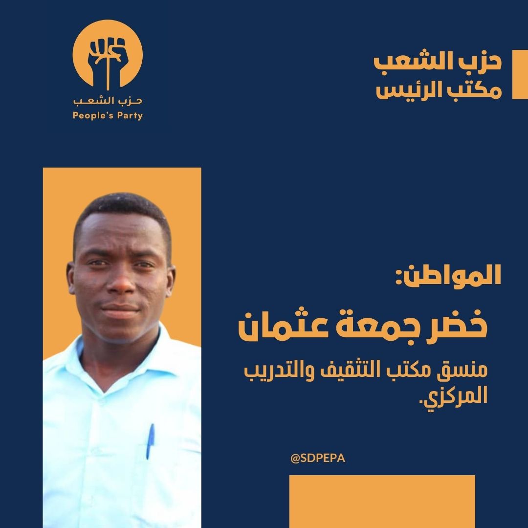 اصدر المواطن عبد الله عبد الوهاب ادريس رئيس الحزب قرارا بتكليف المواطن خضر جمعة عثمان منسقا لمكتب التثقيف والتدريب المركزي.