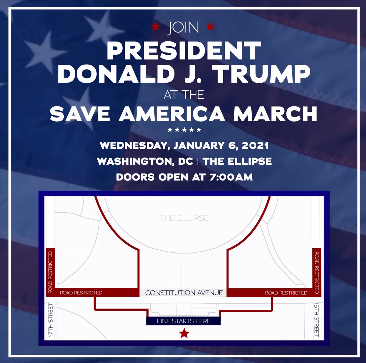 I will be speaking at the SAVE AMERICA RALLY tomorrow on the Ellipse at 11AM Eastern. Arrive early — doors open at 7AM Eastern. BIG CROWDS!