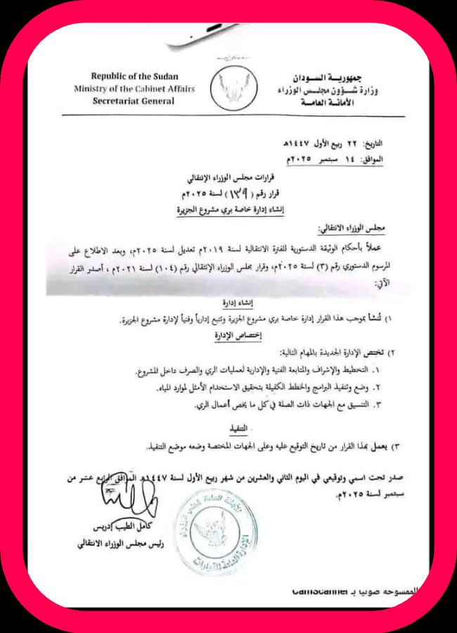 ■ عقب عودته إلى بورتسودان من رحلة ولاية الجزيرة، أصدر رئيس الوزراء قرارًا بالرقم 139 لسنة 2025 بإنشاء إدارة خاصة بري مشروع الجزيرة تختص بالتخطيط والإشراف والمتابعة الفنية والإدارية لعمليات الري والصرف داخل المشروع.