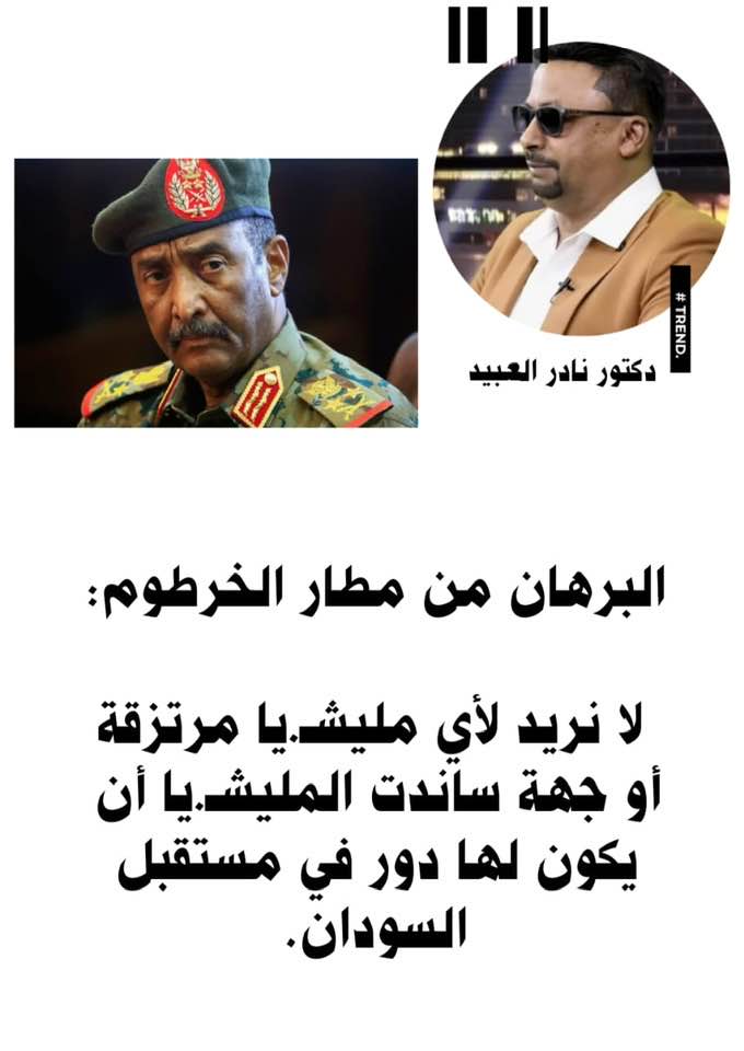 نادر البدوي الكلام انتهي By null Published October 22, 2025 Share SHARE Facebook Twitter Pinterest LinkedIn الكلام انتهي Source Facebook Twitter Pinterest LinkedIn Share This Article Facebook Twitter Email Print Previous Article الحرية.. العدل.. السلام.. الديمقراطية حركة/ جيش تحرير السودان القيادة العامة… Next Article اقتحمت مليشيا الدعم السريع منازل المواطنين في «حي النصرات» شمال مدينة الفاشر أث… Leave a Comment Leave a Reply Cancel replyYour email address will not be published. Required fields are marked *Comment * Name * Email * Website Save my name, email, and website in this browser for the next time I comment. Δ SearchSearchRecent Postsالإجابات المباشرة على التساؤلات المتكررة حول الجنجويد ومستقبل الصراع التي تردني … رئيس مجلس السيادة يصدر قراراً بتعيين الفريق أول شرطة حقوقي أمير عبدالمنعم فضل م… … True … My interview tonight discussing the meeting between the US and Sudan; what it me… Recent CommentsNo comments to show.