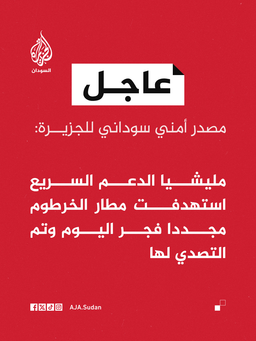 الجزيرة عاجل | مصدر أمني سوداني للجزيرة: مليشيا الدعم السريع استهدفت مطار #الخرطوم مجددا… By null Published October 22, 2025 Share SHARE Facebook Twitter Pinterest LinkedIn عاجل | مصدر أمني سوداني للجزيرة: مليشيا الدعم السريع استهدفت مطار #الخرطوم مجددا فجر اليوم وتم التصدي لها Source Facebook Twitter Pinterest LinkedIn Share This Article Facebook Twitter Email Print Previous Article كوريا الشمالية تطلق عدة صواريخ باليستية قصيرة المدى قبل قمة أبيك في كوريا الجنوب… Next Article القول هو ما قاله البرهان عن المتمردين Leave a Comment Leave a Reply Cancel replyYour email address will not be published. Required fields are marked *Comment * Name * Email * Website Save my name, email, and website in this browser for the next time I comment. Δ SearchSearchRecent Postsاول عاصمة للسودان الحديث.. وكالة السودان للأنباء: توقيع اتفاقيات تعاون بين عدد من الوزارات السودانية ورابطة… قائد الدعم السريع ورئيس المجلس الرئاسي لحكومة “تأسيس” الموازية، محمد حمدان دقلو:… نهار اليوم.. قصف مدفعي عنيف من قبل مليشيا الدعم السريع على مدينة الفاشر، بولاية… البعث العربي بعد شنق صدام يرحب بامريكا Recent CommentsNo comments to show.