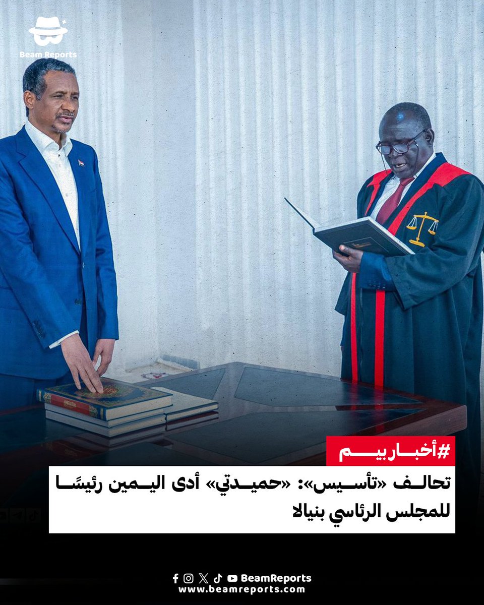 يأتي أداء «حميدتي» اليمين، اليوم السبت، رئيسًا للمجلس الرئاسي المعلن عنه من تحالف «تأسيس»، في نيالا، بعد نحو شهر من إعلان التحالف عن تشكيل مجلس رئاسي وحكومة موازية برئاسة محمد حسن التعايشي، وفي ظل إجراءات أمنية مشددة وتكتم بشأن أماكن إقامة أعضاء الحكومة ومقر أداء اليمين.
