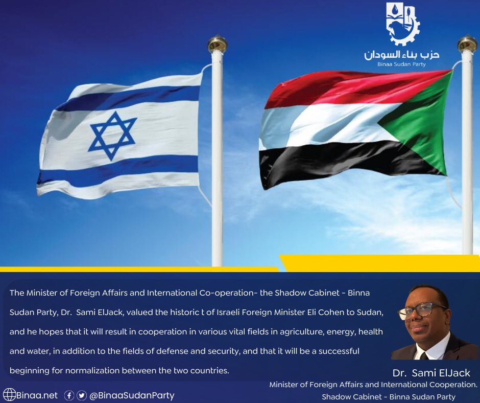 The Minister of Foreign Affairs and International Co-operation- the Shadow Cabinet – Binna Sudan Party, Dr. Sami ElJack, valued the historical visit of Israeli Foreign Minister Eli Cohen to Sudan