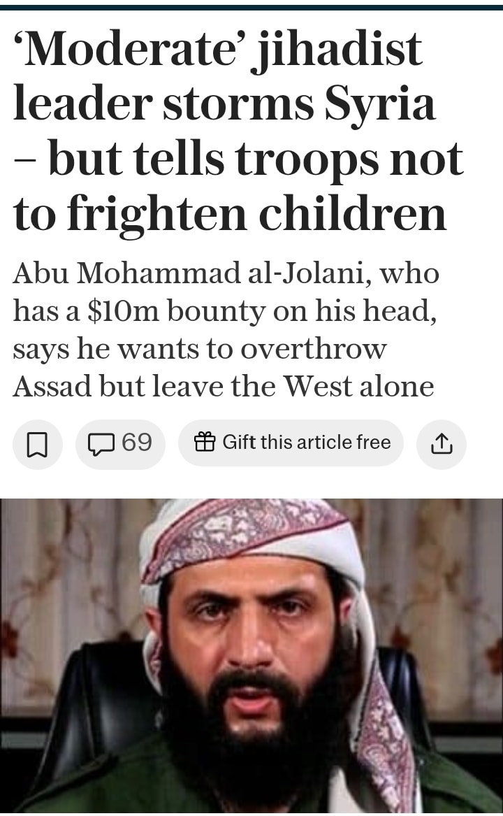 في نوفمبر قبل اسقاط بشار الاسد في تحالف أمريكي تركي (ومقايضة مع روسيا)، بل قبله بفترة تم تدشين مصطلح “جهادي معتدل” لينسخ تصنيف إرهابي، الذي صدعوا به رؤوس العالمين، هذا الخبر التمهيدي نشر في ديلي تلغراف، وقبله كثير من الفيديوهات لشباب تم وصفهم بالجهاديين المعتدلين، وهم في جماعات مصنفة ارهابيا وانها خطر على العالم والدول المجاورة وكان يتم قصف معسكراتها لفترة.