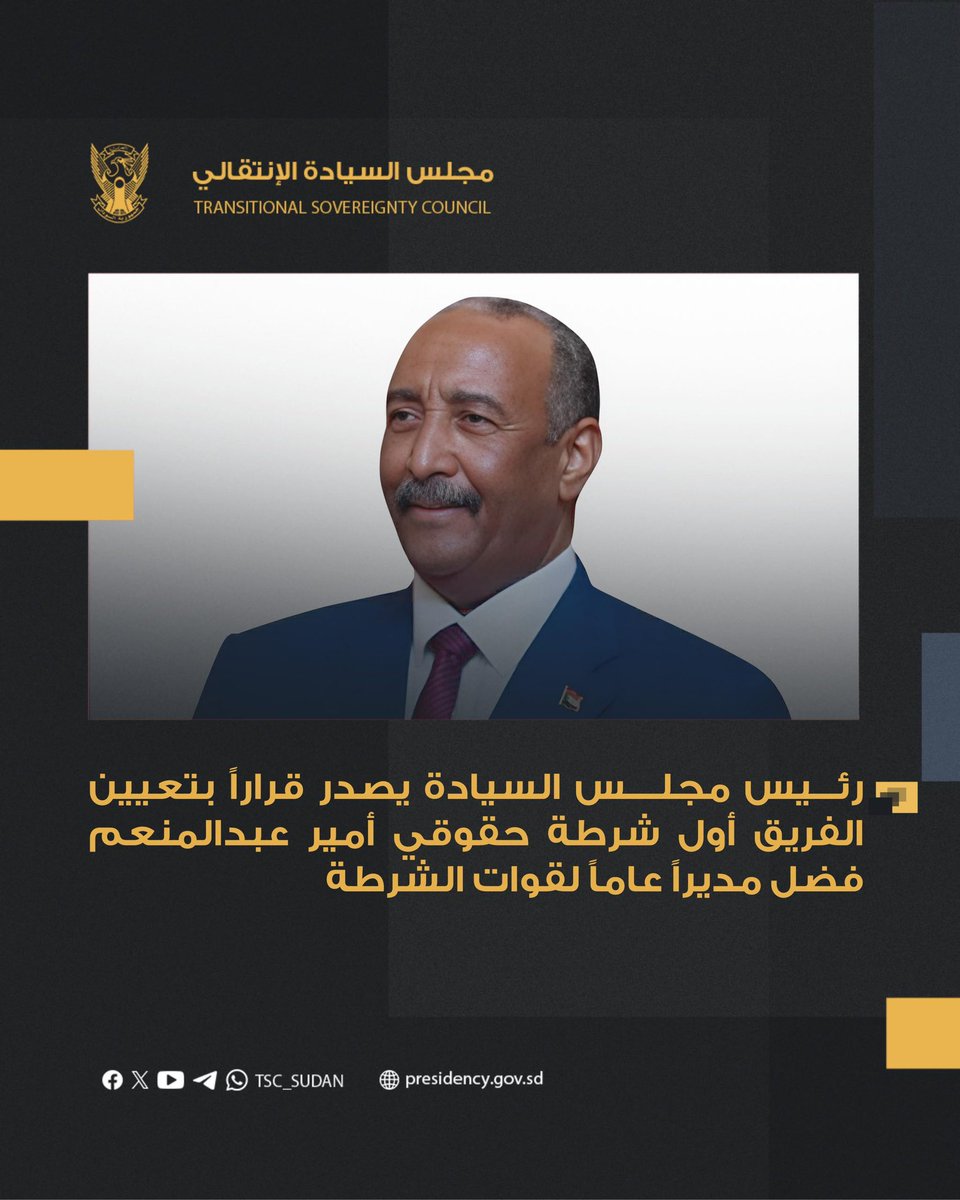 مجلس السيادة رئيس مجلس السيادة يصدر قراراً بتعيين الفريق أول شرطة حقوقي أمير عبدالمنعم فضل م… By null Published October 22, 2025 Share SHARE Facebook Twitter Pinterest LinkedIn ⭕️ رئيس مجلس السيادة يصدر قراراً بتعيين الفريق أول شرطة حقوقي أمير عبدالمنعم فضل مديراً عاماً لقوات الشرطة بورتسودان ١٠-٩-٢٠٢٥م Source by مجلس السيادة الإنتقالي – السودان Facebook Twitter Pinterest LinkedIn Share This Article Facebook Twitter Email Print Previous Article غير متأكد أن حميدتي حي؟ لأن ما يقدم الآن وعلى مدى سنتين ونصف تسجيلات تسجيلات وهن… Next Article الإجابات المباشرة على التساؤلات المتكررة حول الجنجويد ومستقبل الصراع التي تردني … Leave a Comment Leave a Reply Cancel replyYour email address will not be published. Required fields are marked *Comment * Name * Email * Website Save my name, email, and website in this browser for the next time I comment. Δ SearchSearchRecent Postsتذكير بركن نقاش اليوم بعد اقل من ساعة بعنوان : بناء الدولة على قناة الحزب في ت… محلية الخرطوم تنفذ حملة واسعة لإزالة المخالفات وضبط المظاهر السالبة في منطقة وسط… اقرأ الخبر إن فاتك: تركيا تسعى لشراء ٢٤ طائرة يوروفايتر تايفون مستعملة من قطر ضم… سلاح الجو السوداني يشنٌ غاراتٍ جوية على تجمعات الدعم السريع زالنجي. #Sudan_War… اللهم لك الحمد حتي ترضي و لك الحمد إذا رضيت Recent CommentsNo comments to show.