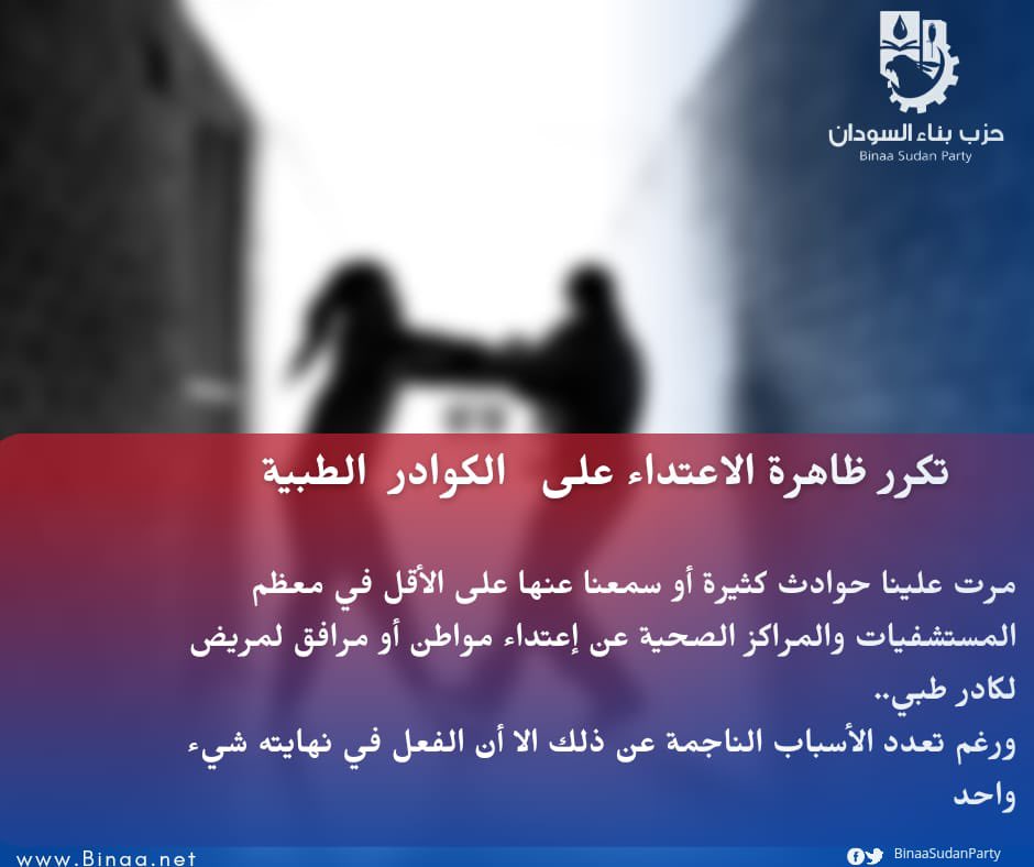 حزب بناء السودان مرت علينا حوادث كثيرة أو سمعنا عنها على الأقل في معظم المستشفيات والمراكز الصحية… By null Published October 22, 2025 Share SHARE Facebook Twitter Pinterest LinkedIn مرت علينا حوادث كثيرة أو سمعنا عنها على الأقل في معظم المستشفيات والمراكز الصحية عن إعتداء مواطن أو مرافق لمريض لكادر طبي..! ورغم تعدد الأسباب الناجمة عن ذلك الا أن الفعل في نهايته شيء واحد.. Source by حزب بناء السودان Facebook Twitter Pinterest LinkedIn Share This Article Facebook Twitter Email Print Previous Article خرجت مواكب هادرة في العاصمة والولايات، مما يؤكد حماسة وإصرار ورغبة الثوار في الح… Next Article التحالف المدني الديمقراطي لقوى الثورة – صمود تصريح صحافي ببالغ الأسى والحزن تا… Leave a Comment Leave a Reply Cancel replyYour email address will not be published. Required fields are marked *Comment * Name * Email * Website Save my name, email, and website in this browser for the next time I comment. Δ SearchSearchRecent Postsمصرع عبد الرحيم ود أبوك خال المتمرد حميدt و15 من ضباط المليشيا في غارة جوية للجي… لان عقلية الجيش مبنية على صناعة الفوضى عكس كل جيوش العالم الجيش مصدر الاستقرار و… ضبط بحوزتهم أزياء ورتب عسكرية.. إغلاق 19 مكتباً تنتحل صفة القوة المشتركة في منطق… سؤال الهوية في بلاد النهر و روافده أصبح بلا قيمة، فقد تم الإخضاع وانتهى قبل 500… عضو مجلس السيادة د. نوارة أبو محمد تؤكد دعم الدولة لمساهمات المرأة في مرحلة الإ… Recent CommentsNo comments to show.