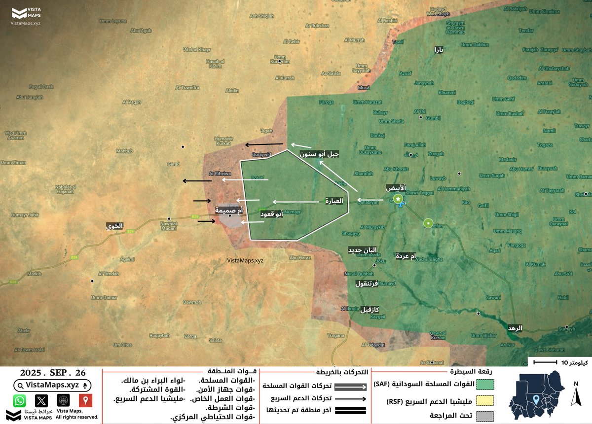 ◉ سيطرة القوات المسلحة على منطقتي العيارة وأبو قعود أنهت وجود المليشيا هناك والذي كان يمثل تهديدًا يثير القلق لمدينة الأبيض.
