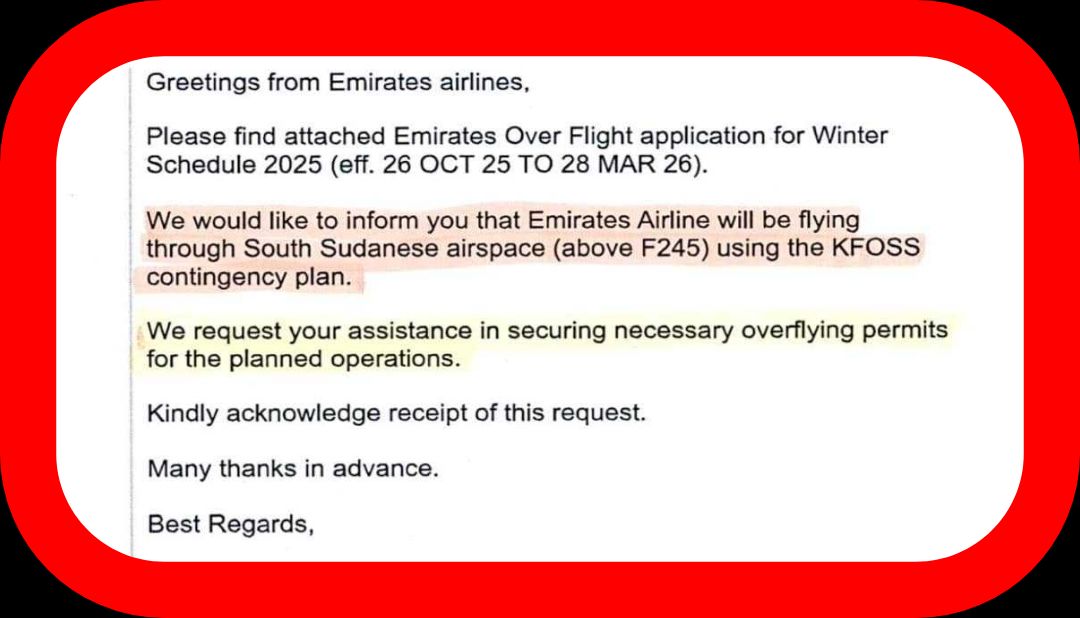 ■ تقدمت شركة طيران الإمارات رسميًا إلى سلطة الطيران المدني السوداني بطلب تصريح عبور المجال الجوي لجنوب السودان فوق (F245) باستخدام خطة الطوارئ (KFOSs)..