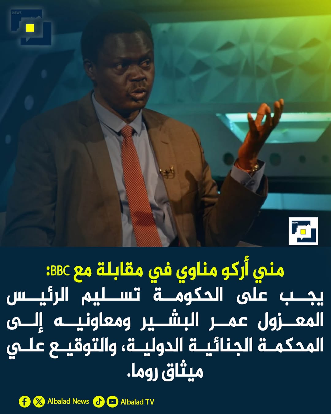 محمد السر مساعد مني أركو مناوي في مقابلة مع BBC: يجب على الحكومة تسليم الرئيس المعزول عمر البش… By null Published October 22, 2025 Share SHARE Facebook Twitter Pinterest LinkedIn مني أركو مناوي في مقابلة مع BBC: يجب على الحكومة تسليم الرئيس المعزول عمر البشير ومعاونيه إلى المحكمة الجنائية الدولية، والتوقيع علي ميثاق روما. Source Facebook Twitter Pinterest LinkedIn Share This Article Facebook Twitter Email Print Previous Article والي الشمالية عبد الرحمن عبد الحميد يترجّل من سيارته لتحيّة طالبات من المرحلة ال… Next Article اكلوووا اخوان واتحاسبووا تجار Leave a Comment Leave a Reply Cancel replyYour email address will not be published. Required fields are marked *Comment * Name * Email * Website Save my name, email, and website in this browser for the next time I comment. Δ SearchSearchRecent Postsيقولون لك: لماذا أوجعكم الشيخ صاحب اللحية في الجزيرة ولم توجعكم دارفور؟ في الحق… بيان صحفي ٢٠٢٥/٩/٩م … I spoke to Secretary of State Brad Raffensperger yesterday about Fulton County a… Exactly … In Darfur, Sudan, kidnapping is now a weapon of war. “These aren’t rogue cases. … Recent CommentsNo comments to show.