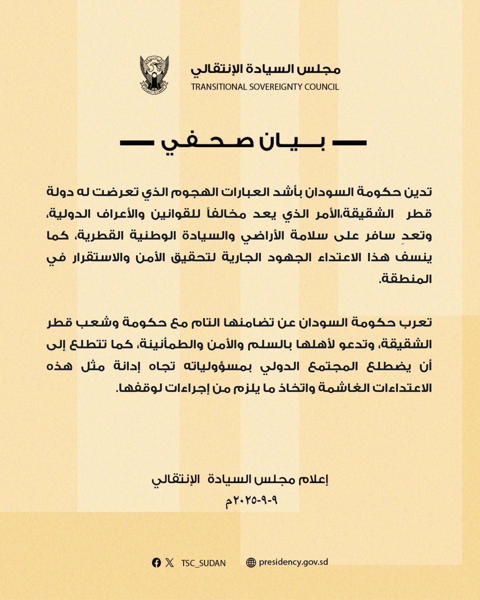 مجلس السيادة بيان صحفي ٢٠٢٥/٩/٩م … By null Published October 23, 2025 Share SHARE Facebook Twitter Pinterest LinkedIn ⭕️ بيان صحفي ٢٠٢٥/٩/٩م Source by مجلس السيادة الإنتقالي – السودان Facebook Twitter Pinterest LinkedIn Share This Article Facebook Twitter Email Print Previous Article I spoke to Secretary of State Brad Raffensperger yesterday about Fulton County a… Next Article يقولون لك: لماذا أوجعكم الشيخ صاحب اللحية في الجزيرة ولم توجعكم دارفور؟ في الحق… Leave a Comment Leave a Reply Cancel replyYour email address will not be published. Required fields are marked *Comment * Name * Email * Website Save my name, email, and website in this browser for the next time I comment. Δ SearchSearchRecent Postsالتقيت اليوم وزيرة التعليم العالي بروف انتصار صغيرون بمكتبها ، ناقشنا سير تنفيذ … التحالف المدني الديمقراطي لقوى الثورة “صمود” بيان حول قيام سلطتين متنازعتين في ا… لو مهتمين بمجالات السياحة والثقافة ممكن تطلعوا على الخطة الاستراتيجية لملف السيا… شجر متشابك الهامات وجيلاً جاى حلو الشهد صبايا وفتيه يمرحوا فى صباح الغد عيونهم ب… لم يعرف السودان الجيوش النظامية الا حديثاً لكن له تاريخ طويل مع الميلشيات #احن… Recent CommentsNo comments to show.
