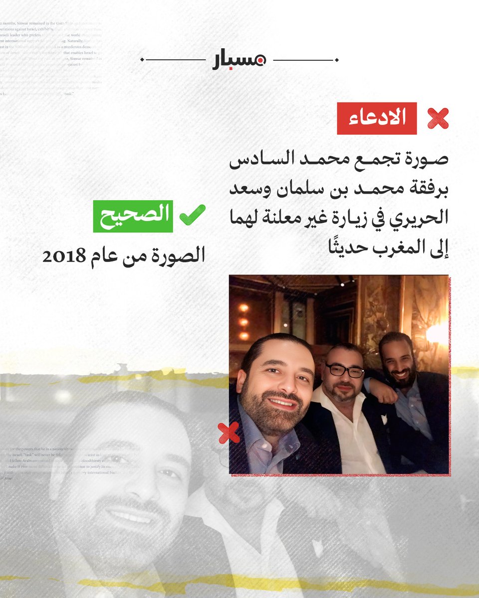 🔴 الصورة نشرها رئيس الوزراء اللبناني السابق سعد الحريري على حسابه في منصة إكس، في إبريل 2018، وجمعته بوليّ العهد السعودي الأمير محمد بن سلمان وملك المغرب محمد السادس في باريس، وعلّق عليها بعبارة: “لا تعليق”.