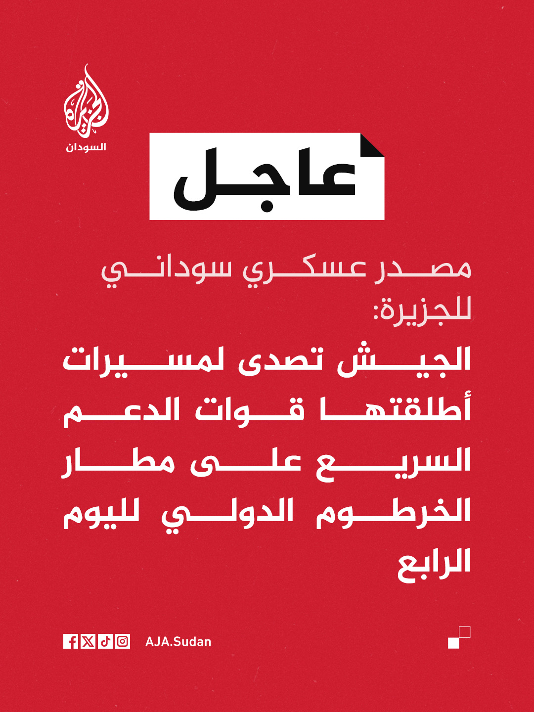 الجزيرة عاجل | مصدر عسكري سوداني للجزيرة: الجيش تصدى لمسيرات أطلقتها قوات الدعم السريع ع… By null Published October 24, 2025 Share SHARE Facebook Twitter Pinterest LinkedIn عاجل | مصدر عسكري سوداني للجزيرة: الجيش تصدى لمسيرات أطلقتها قوات الدعم السريع على مطار #الخرطوم الدولي لليوم الرابع Source Facebook Twitter Pinterest LinkedIn Share This Article Facebook Twitter Email Print Previous Article حالة #الطقس في #السودان اليوم #الشرق_السودان Next Article Commenting has been turned off for this post. Leave a Comment Leave a Reply Cancel replyYour email address will not be published. Required fields are marked *Comment * Name * Email * Website Save my name, email, and website in this browser for the next time I comment. Δ SearchSearchRecent Postsلفت تقرير منظمة عديلة الذي اعتمد على المصادر المفتوحة، علاوةً علي عمليات رصد است… قصة تفوق طالبة من مخيمات اللجوء في الامتحانات الشهادة الثانوية المؤجلة تقرير عبد… هولاء حيكونو عبره إن شاء الله لكل جهة داخل الدولة من التيارات القديمة العنصرية. … ثقتنا في البرهان لا تحدها حدود مقاتلا او مسالما وخطوط الوطن الحمراء في كامل الحف… من بداية الحرب في 15 إبريل 2023م اخترنا خيار وقف وإنهاء الحرب ، وإستعادة مسار … Recent CommentsNo comments to show.