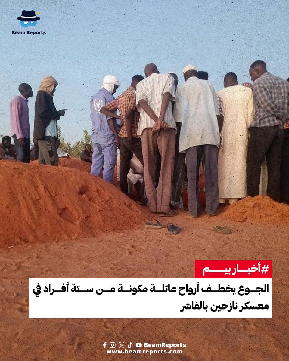 خطف الجوع أرواح عائلة مكونة من ستة أفراد بينهم أطفال في معسكر نيفاشا للنازحين بالفاشر بشمال دارفور حيث يكافح مئات الآلاف الجوع للبقاء على قيد الحياة وسط حصار مميت تفرضه قوات الدعم السريع. وقالت تنسيقية لجان المقاومة الفاشر، الثلاثاء إن الضحايا قضوا جراء الجوع وتسمم غذائي بعد تناولهم «الأمباز» – وهو بقايا طحن الحبوب ومخلفات صناعة الزيوت – حيث يُستخدم عادةً كعلف للحيوانات.