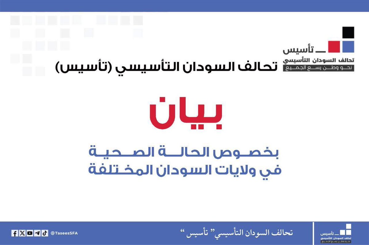 يتابع تحالف السودان التأسيسي الوضع الصحي الحالي في السودان وتزايد حالات الإصابة بالأمراض والأوبئة ببالغ الاهتمام، ويولي معالجة ذلك أولوية قصوى. إن انتشار الأوبئة والأمراض المختلفة، سواء المعروفة منها والناتجة عن الإصابة بالميكروبات، أو ما نتج بفعل الآثار السلبية لاستخدام الأسلحة المحرمة، هو نتيجة لإصرار طرف جيش الإسلاميين وكتائبه على استمرار هذه الحرب وتغليب مصالحهم على مصلحة الشعوب السودانية في أبسط حقوقها ، وهو حق الحياة.