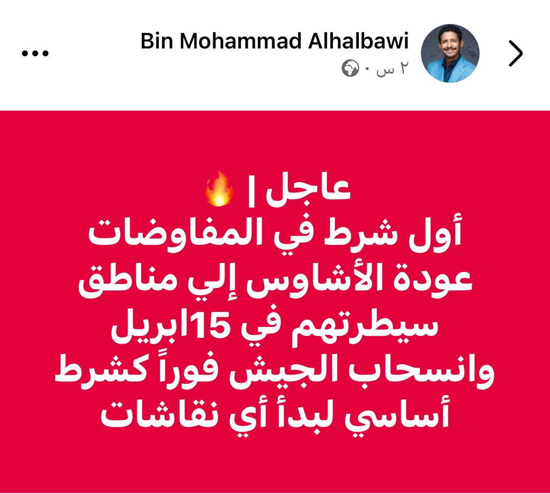 نادر البدوي انت انسحبت من الخرطوم عشان ترجع ليها راجع كلام النور حمد ( في زول احتل محل بيطل… By null Published October 24, 2025 Share SHARE Facebook Twitter Pinterest LinkedIn انت انسحبت من الخرطوم عشان ترجع ليها راجع كلام النور حمد ( في زول احتل محل بيطلع منه ) انت فاكر العبط بتاعكم اصابنا ؟؟؟؟ Source Facebook Twitter Pinterest LinkedIn Share This Article Facebook Twitter Email Print Previous Article ملاحظات عابرة…!! Next Article مصادر دبلوماسية سودانية لـ”الشرق”: – انتهاء الجلسة الأولى من الاجتماعات المبا… Leave a Comment Leave a Reply Cancel replyYour email address will not be published. Required fields are marked *Comment * Name * Email * Website Save my name, email, and website in this browser for the next time I comment. Δ SearchSearchRecent Postsقالت منظمة يونيسيف إنها تمكنت لأول مرة منذ أكتوبر 2024 من إيصال قافلة مساعدات إن… ■ محادثات وزير الخارجية السودانية مع مسؤولين أمريكيين بواشنطن ذات صلة مباشرة بمق… مقاومة الفاشر: أي اتفاق سياسي أو تفاوضي يجب أن يشمل إزالة كافة أشكال التواجد الع… الموجود في أمريكا وزير الخارجية ليس لواء يعني حكومة وليس جيش #المرياع_ماينوم #لإقتلاع #إرادة_الحركة_الجماهيرية_هي_الحل Recent CommentsNo comments to show.