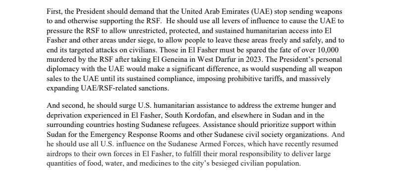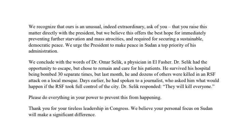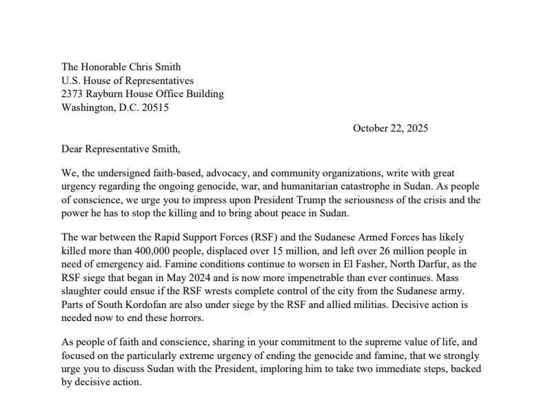 اكثر من ثلاثين منظمة مجتمع مدنى امريكى وجماعات دينية مسيحية ويهودية ومناهضة للابادة الجماعية تبعث رسالة الى النائب بالكونغرس ورئيس فرعية افريقيا كريس سميث تطالب بالضغط على الامارات لوقف تسليح الجنجوييد وفك الحصار عن الفاشر وحماية وتوفير مسار مساعدات انسانية لها ولباقى السودان.