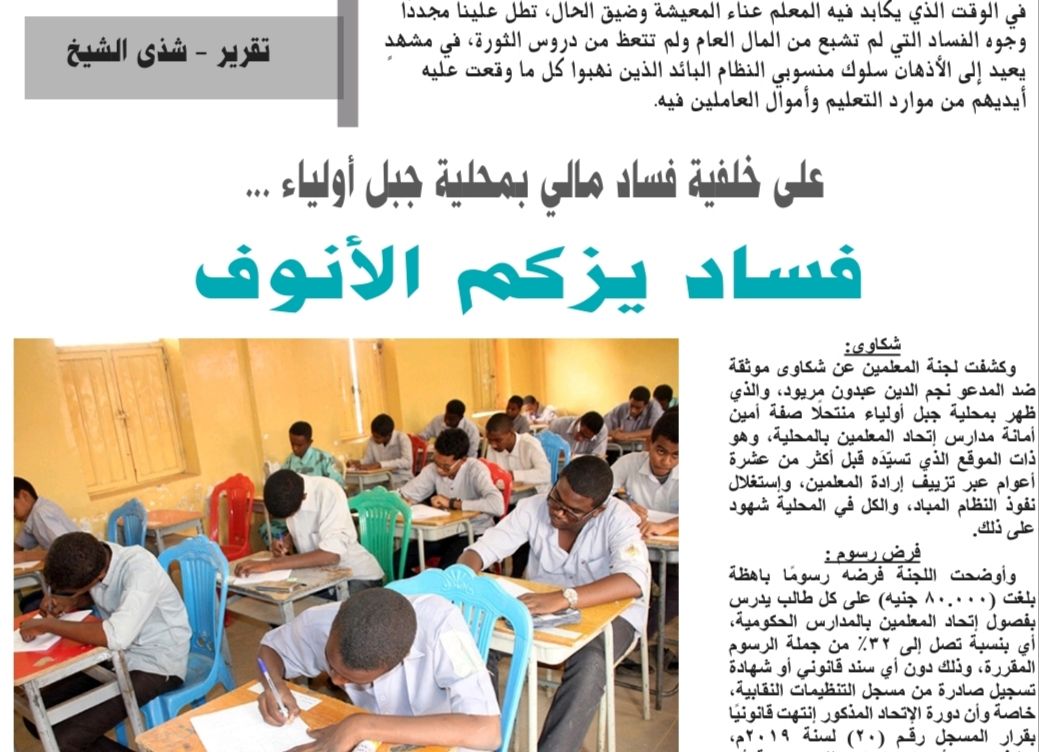 وكشفت لجنة المعلمين عن شكاوى موثقة ضد المدعو نجم الدين عبدون مريود، والذي ظهر بمحلية جبل أولياء منتحلًا صفة أمين أمانة مدارس إتحاد المعلمين بالمحلية، وهو ذات الموقع الذي تسيّدَه قبل أكثر من عشرة أعوام عبر تزييف إرادة المعلمين، وإستغلال نفوذ النظام المباد، والكل في المحلية شهود على ذلك.
