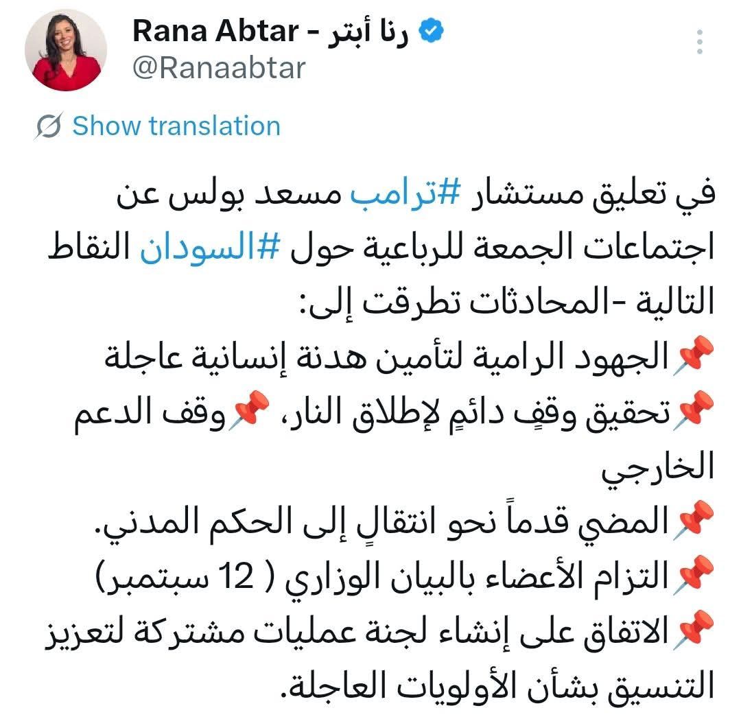 في تعليق مستشار #ترامب مسعد بولس عن اجتماعات الجمعة للرباعية حول #السودان النقاط التالية -المحادثات تطرقت إلى: