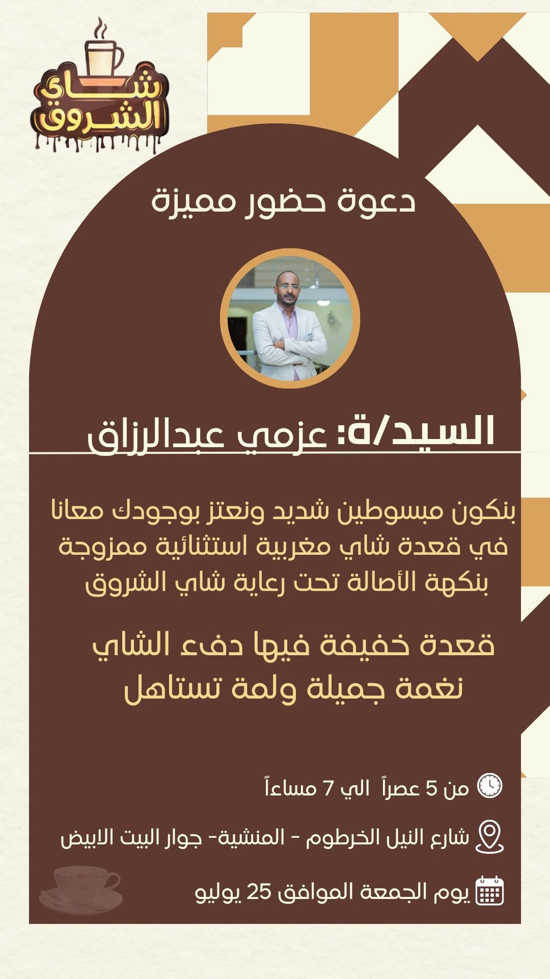 شكراً الأصدقاء في “شاي الشروق” على هذه الدعوة الجميلة، وهى تستحق مكابدة المفازات والحضور، فالبراح والناس والنيل والبرج الأبيض، كلها من الأماكن المحببة العالقة في عروق الذاكرة والوجدان