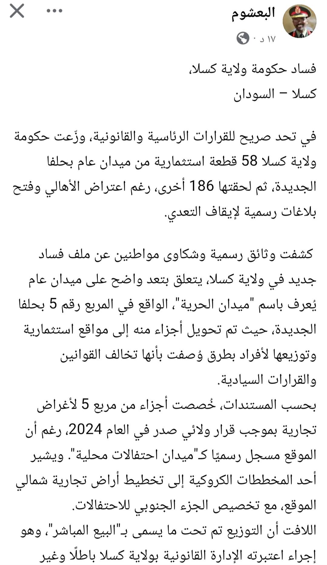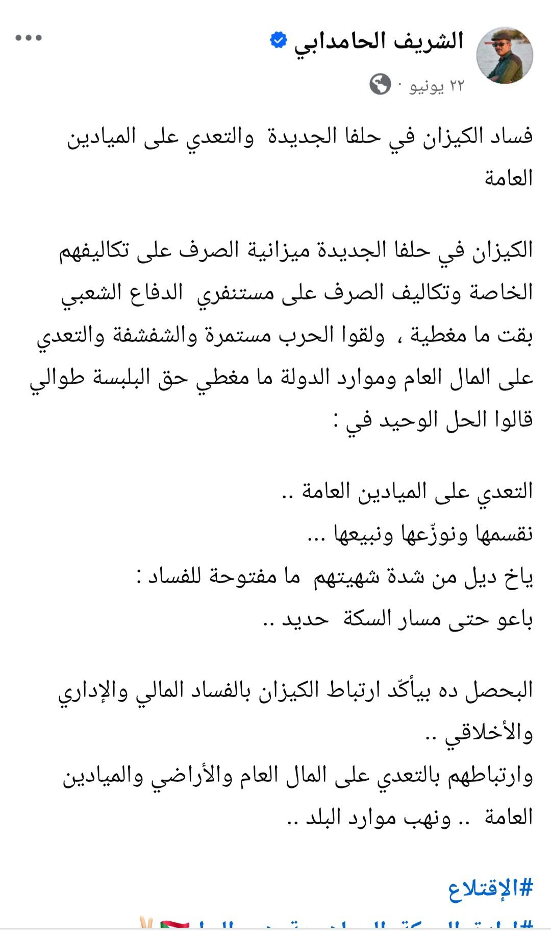 كتبت عن فساد الكيزان والتعدي على الميادين العامة في ولاية كسلا وتحديداً في حلفا الجديدة بتاريخ 22 يونيو
