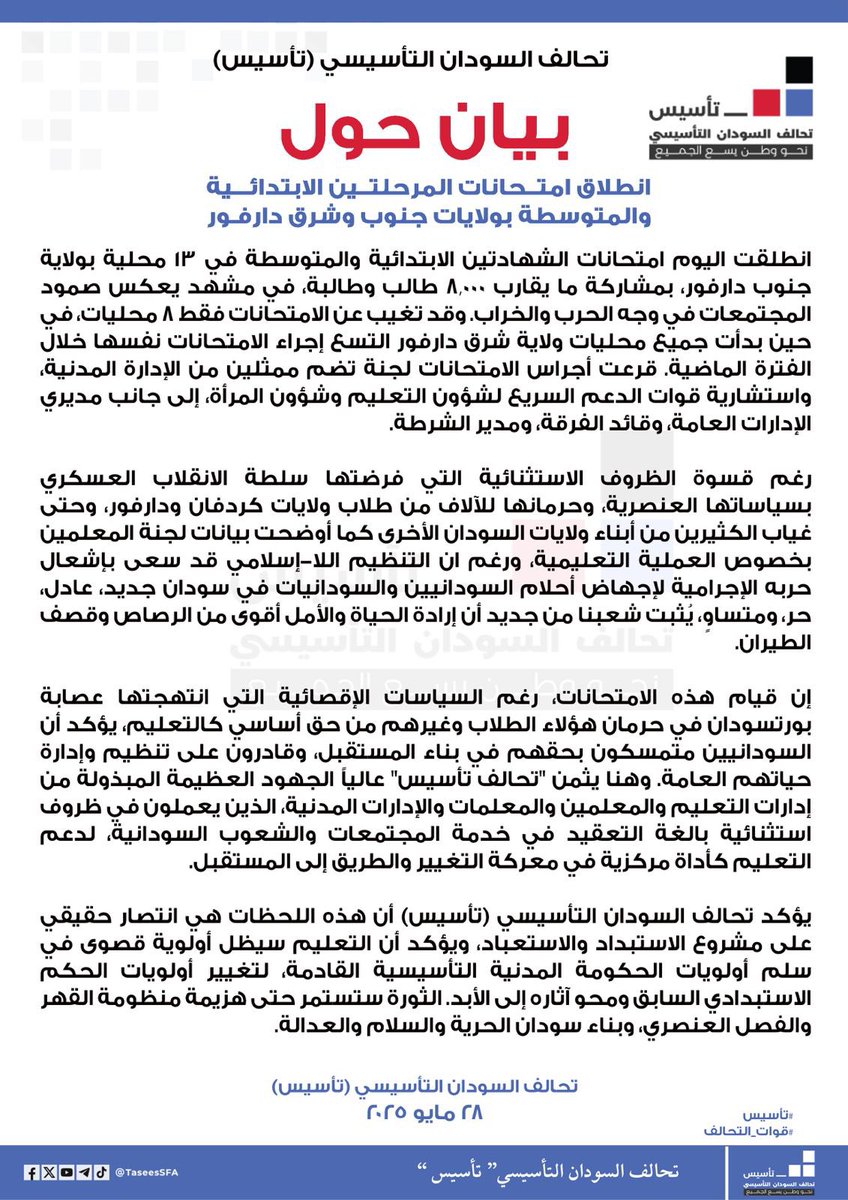#بيان_حول انطلاق امتحانات المرحلتين الابتدائية والمتوسطة بولايات جنوب وشرق دارفو…