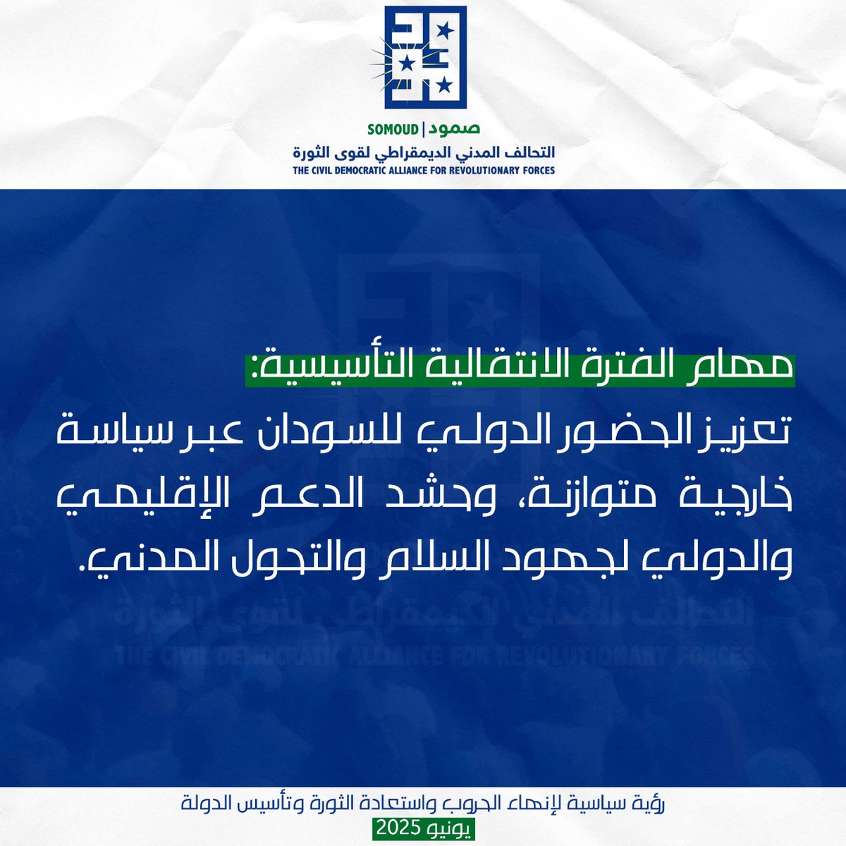مهام الفترة الانتقالية التأسيسية: تعزيز الحضور الدولي للسودان عبر سياسة خارجية متوازنة، وحشد الدعم الإقليمي والدولي لجهود السلام والتحول المدني.