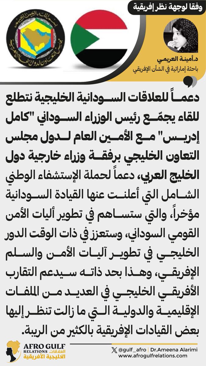 3️⃣ ودعماً للعلاقات السودانية الخليجية نتطلع للقاء يجمّع رئيس الوزراء السوداني “كامل إدريس” مع الأمين العام لدول مجلس التعاون الخليجي برفقة وزراء خارجية دول #الخليج_العربي ، دعماً لحملة الإستشفاء الوطني الشامل التي أعلنت عنها القيادة السودانية مؤخراً والتي ستساهم في تطوير أليات الأمن القومي السوداني، وستعزز في ذات الوقت الدور الخليجي في تطوير آليات الأمن والسلم الإفريقي وهذا بحد ذاته سيدعم التقارب الأفريقي الخليجي في العديد من الملفات الإقليمية والدولية التي ما زالت تنظر إليها بعض القيادات الإفريقية بالكثير من الريبة.