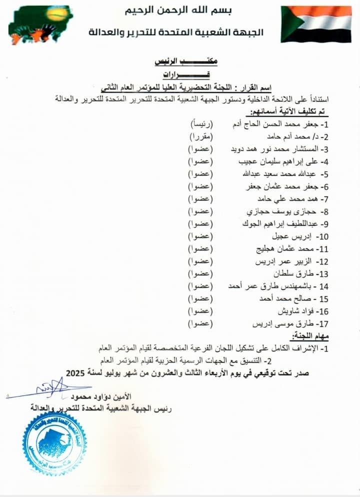 استنادا على اللائحة الداخلية ودستور الجبهة الشعبية المتحدة للتحرير والعدالة