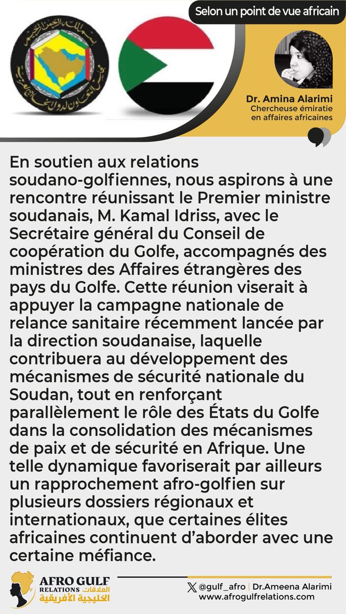 3️⃣ En soutien aux relations soudano-golféennes, nous espérons la tenue d’une rencontre regroupant le Premier ministre soudanais Kamal Idris, le Secrétaire général du Conseil de coopération du Golfe, ainsi que les ministres des Affaires étrangères des pays du Golfe, en appui à la campagne nationale globale de rétablissement récemment annoncée par la direction soudanaise. Cette initiative contribuera au développement des mécanismes de sécurité nationale soudanaise et renforcera parallèlement le rôle des pays du Golfe dans l’évolution des dispositifs de sécurité et de paix en Afrique. Cet engagement soutiendra, en lui-même, le rapprochement afro-golféen sur de nombreux dossiers régionaux et internationaux, encore perçus avec une certaine réserve par certaines directions africaines.