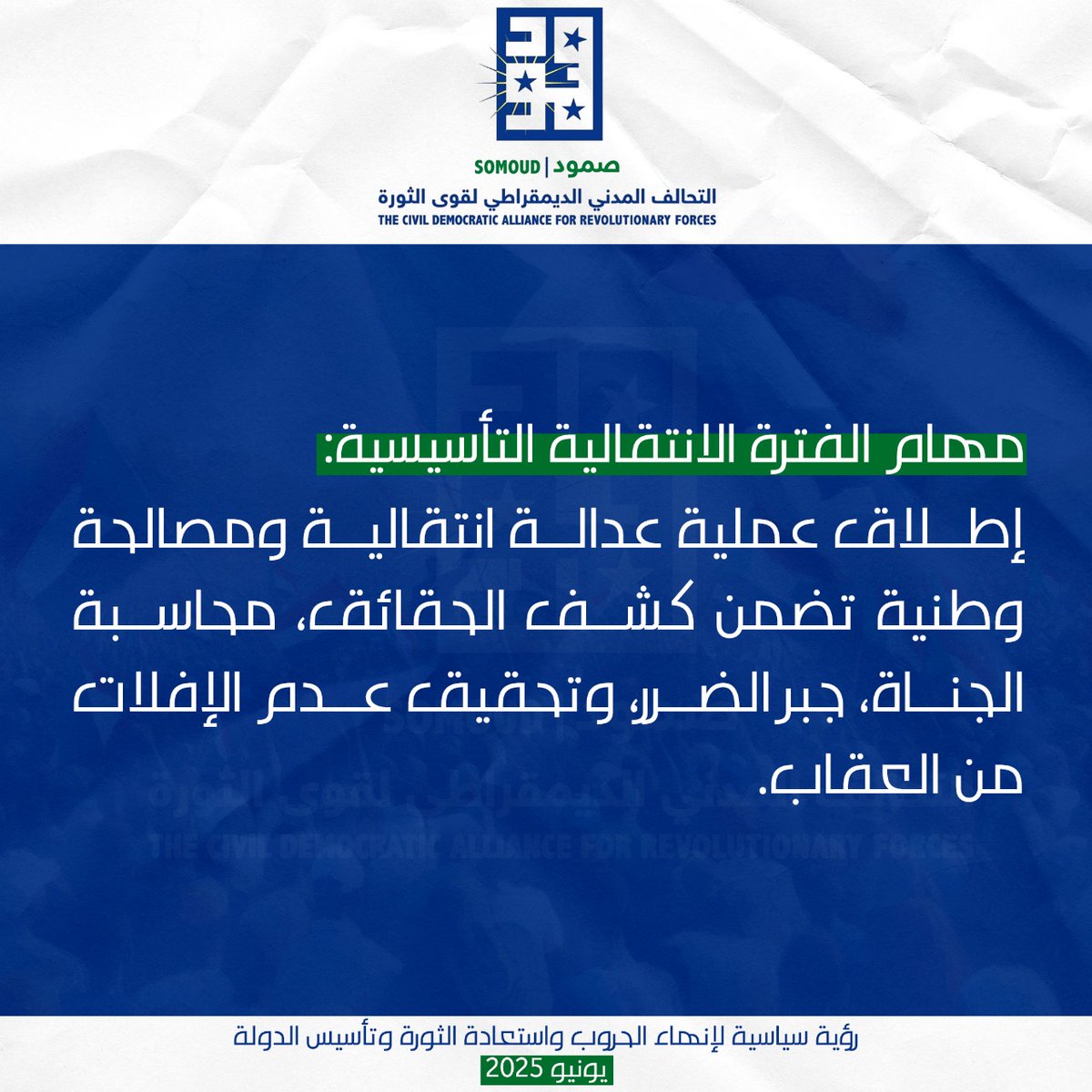 مهام الفترة الانتقالية التأسيسية: إطلاق عملية عدالة انتقالية ومصالحة وطنية تضمن كشف الحقائق، محاسبة الجناة، جبر الضرر، وتحقيق عدم الإفلات من العقاب.
