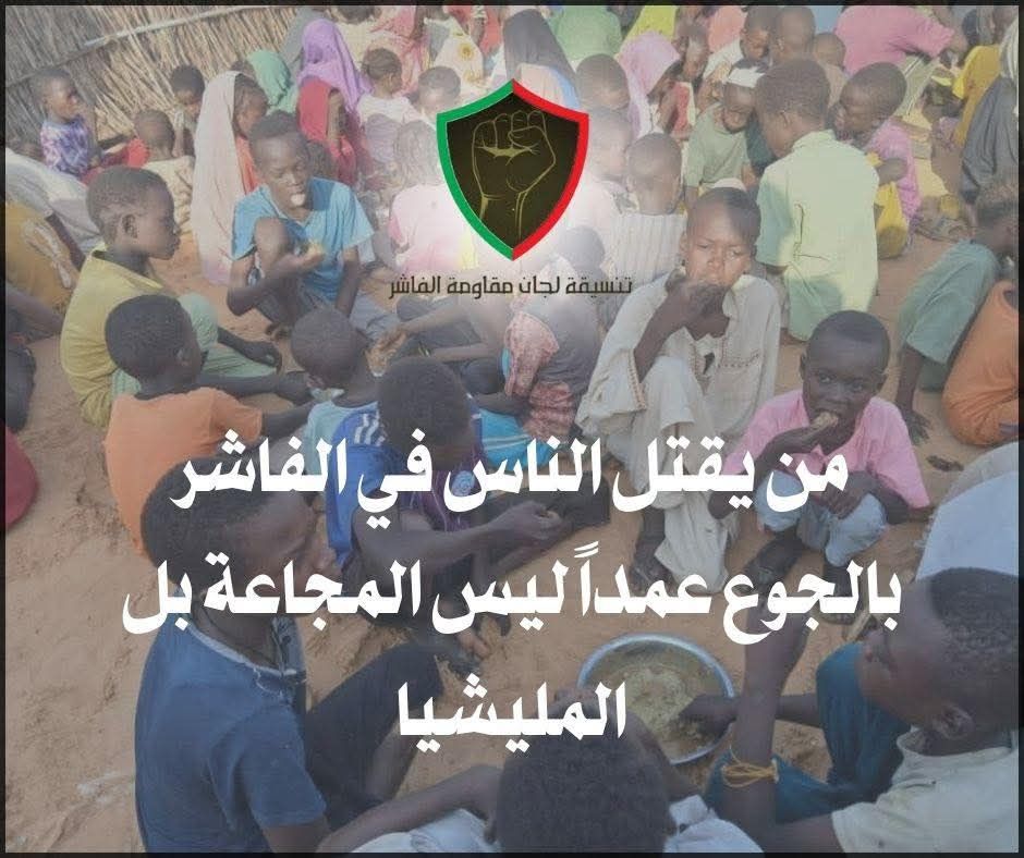 هذا الجوع الذي يفتك بالفاشر ليس كارثة طبيعية وحسب لكنها سياسة تجويع متعمدة ومخطط لها تهدف إلى إذلال وتركيع سكان الفاشر عبر استخدام الجوع كسلاح ، نؤكّد إن ما يجري في الفاشر اليوم هو عملية تجويع متعمدة وممنهجة تستهدف الأطفال والنساء وكبار السن والمرضى في مسعى من مليشيا الدعم السرريع لفرض سيطرتها السياسية والعسكرية على حساب حياة الأبرياء .