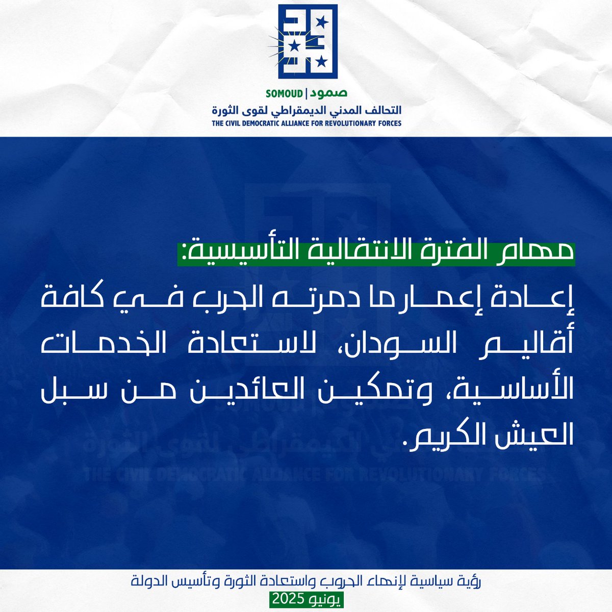 مهام الفترة الانتقالية التأسيسية: إعادة إعمار ما دمرته الحرب في كافة أقاليم السودان، لاستعادة الخدمات الأساسية، وتمكين العائدين من سبل العيش الكريم.