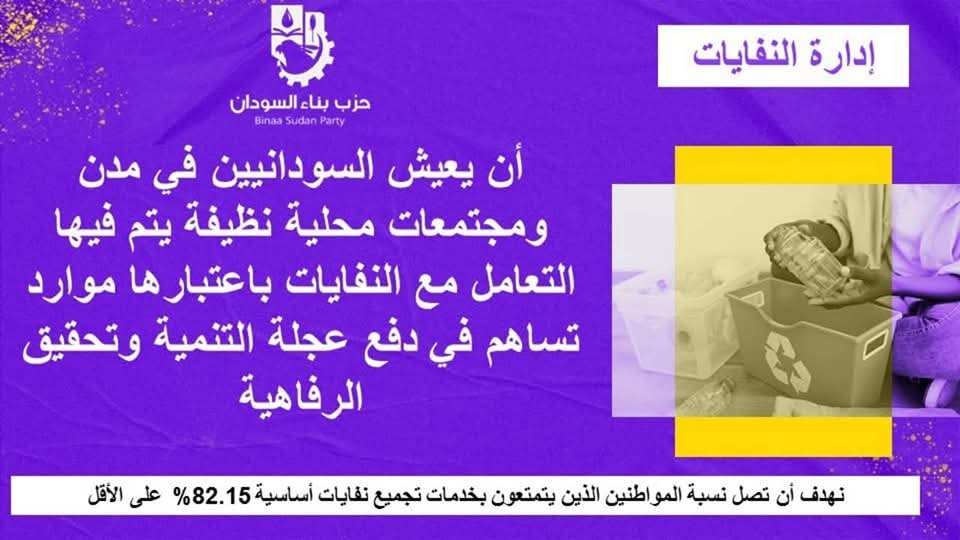 نهدف إلى أن يعيش السودانيين في مدن ومجتمعات محلية نظيفة يتم فيها التعامل مع النفايات باعتبارها موارد تساهم في دفع عجلة التنمية وتحقيق الرفاهية