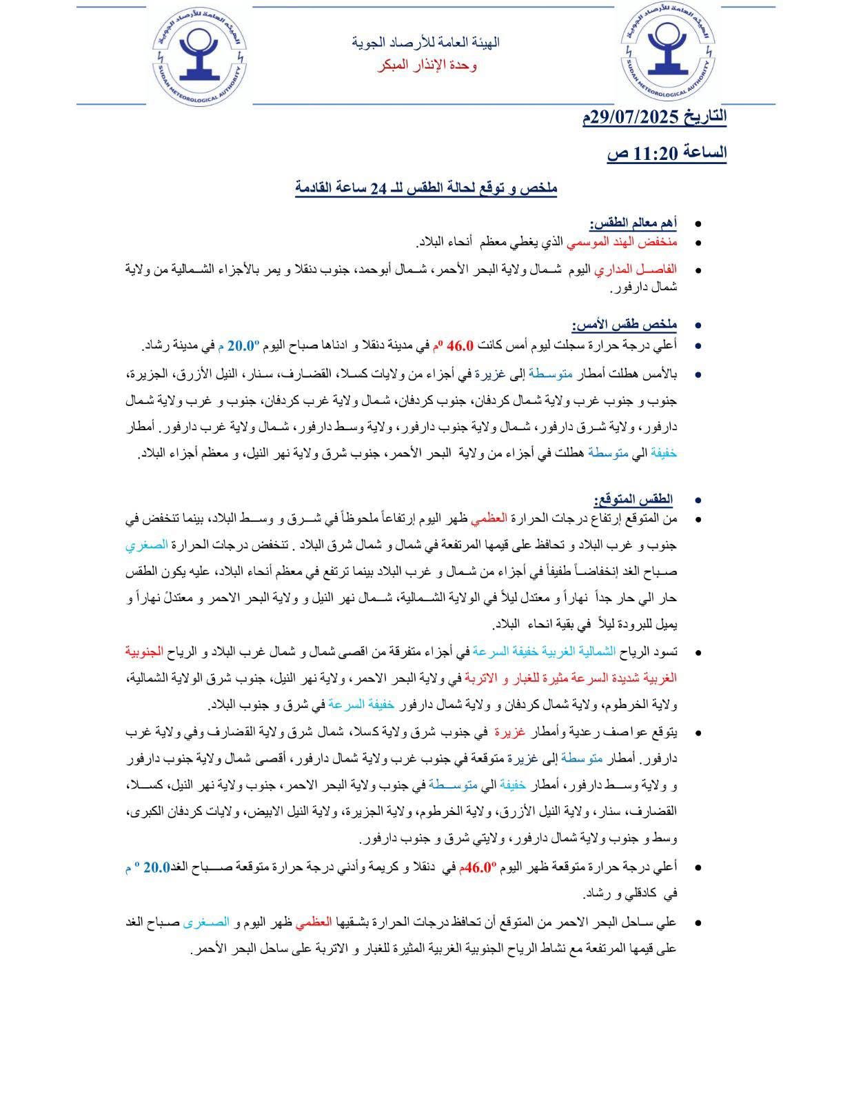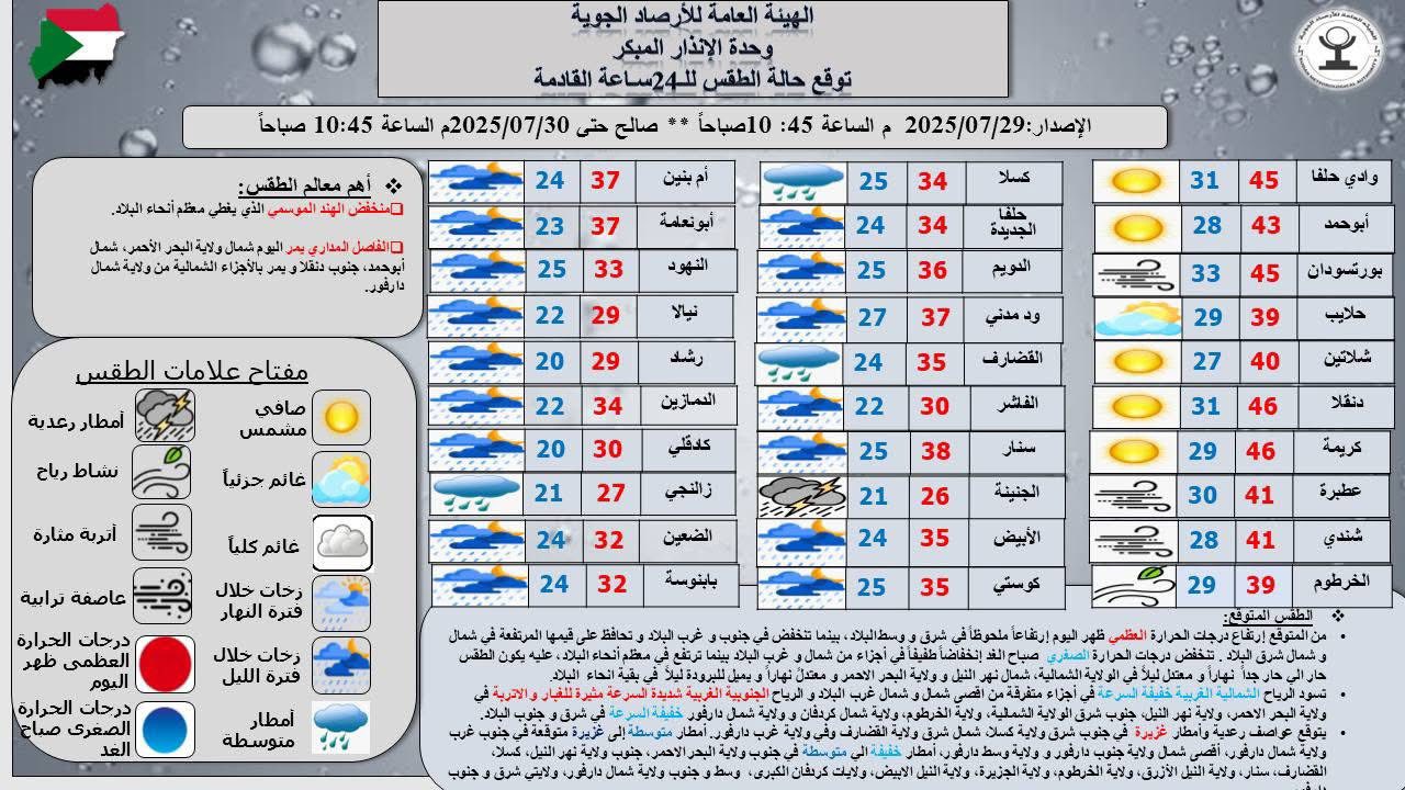 بورتسودان 29-7-2025 (سونا) توقعت الهيئة العامة للأرصاد الجوية ارتفاع ملحوظ في درجات الحرارة العظمى في شرق ووسط البلاد، انخفاض في جنوب وغرب البلاد، استقرار الحرارة المرتفعة في شمال وشمال شرق البلاد