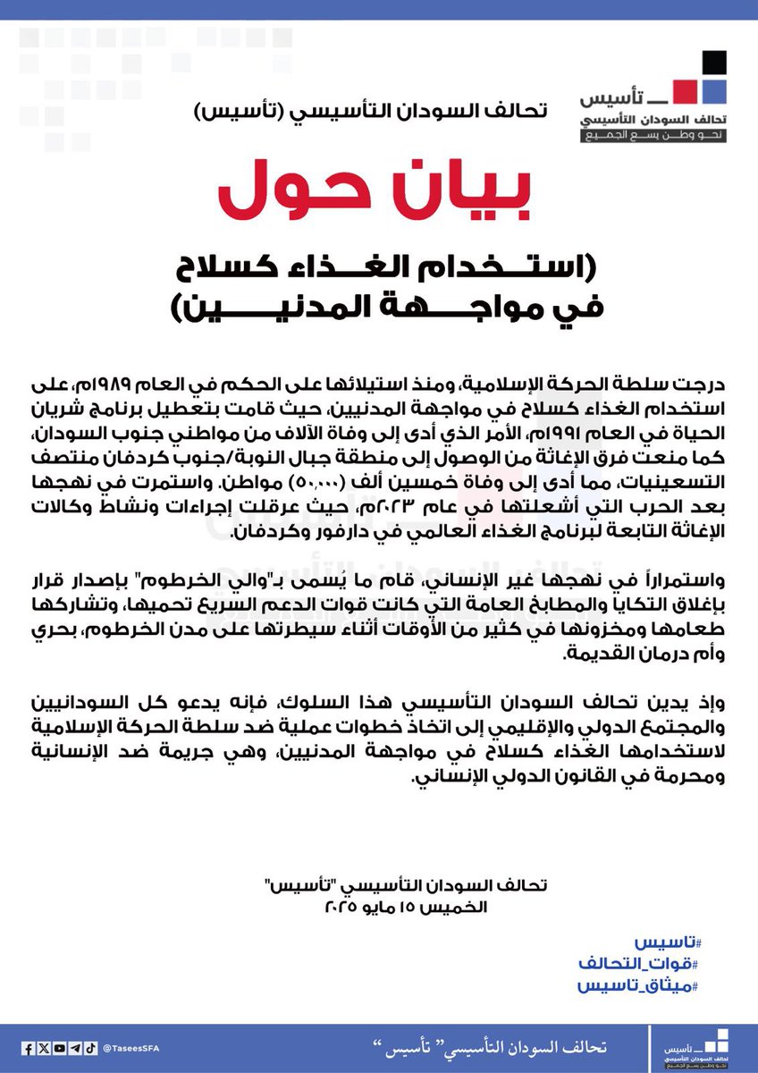 تحالف السودان التأسيسي تأسيس تحالف السودان التأسيسي “تأسيس” بيان حول: (استخدام الغذاء كسلاح في مواجهة المدني… By null Published July 30, 2025 Share SHARE Facebook Twitter Pinterest LinkedIn[ad_1] تحالف السودان التأسيسي “تأسيس” بيان حول: (استخدام الغذاء كسلاح في مواجهة المدنيين) #تاسيس #قوات_التحالف #ميثاق_تاسيس [ad_2] Source by تحالف السودان التأسيسي – (تأسيس) Facebook Twitter Pinterest LinkedIn Share This Article Facebook Twitter Email Print Previous Article مسمى ( #مليونية_الميثاق_الثوري_لتأسيس_سلطة_الشعب )، ليكون هذا اليوم إعلاناً للعم… Next Article ••• بسم الله الرحمن الرحيم حزب الأمــــة القومـــي الأمانــــــة العامــــــ… Leave a Comment Leave a Reply Cancel replyYour email address will not be published. Required fields are marked *Comment * Name * Email * Website Save my name, email, and website in this browser for the next time I comment. Δ SearchSearchRecent Postsأكرمنا الله صباح اليوم الأحد بلقاء إخوةٍ كرام، على ضفة النيل الأزرق، حيث شاي الش… أعلن بنك السودان المركزي في منشور إدارة السياسات رقم (2025/15) رفع الاحتكار عن ا… ندوة بعنوان: القانون الدولي والسيادة الوطنية قراءة في موقف السودان من لجنة تقصي … والي نهر النيل تستقبل وزير الموارد البشرية والرعاية الاجتماعية الوزير يشيد بالأ… كامل ادريس: رئيس اللجنة السياسية لمؤسسات الدولة السودانية. Recent CommentsNo comments to show.
