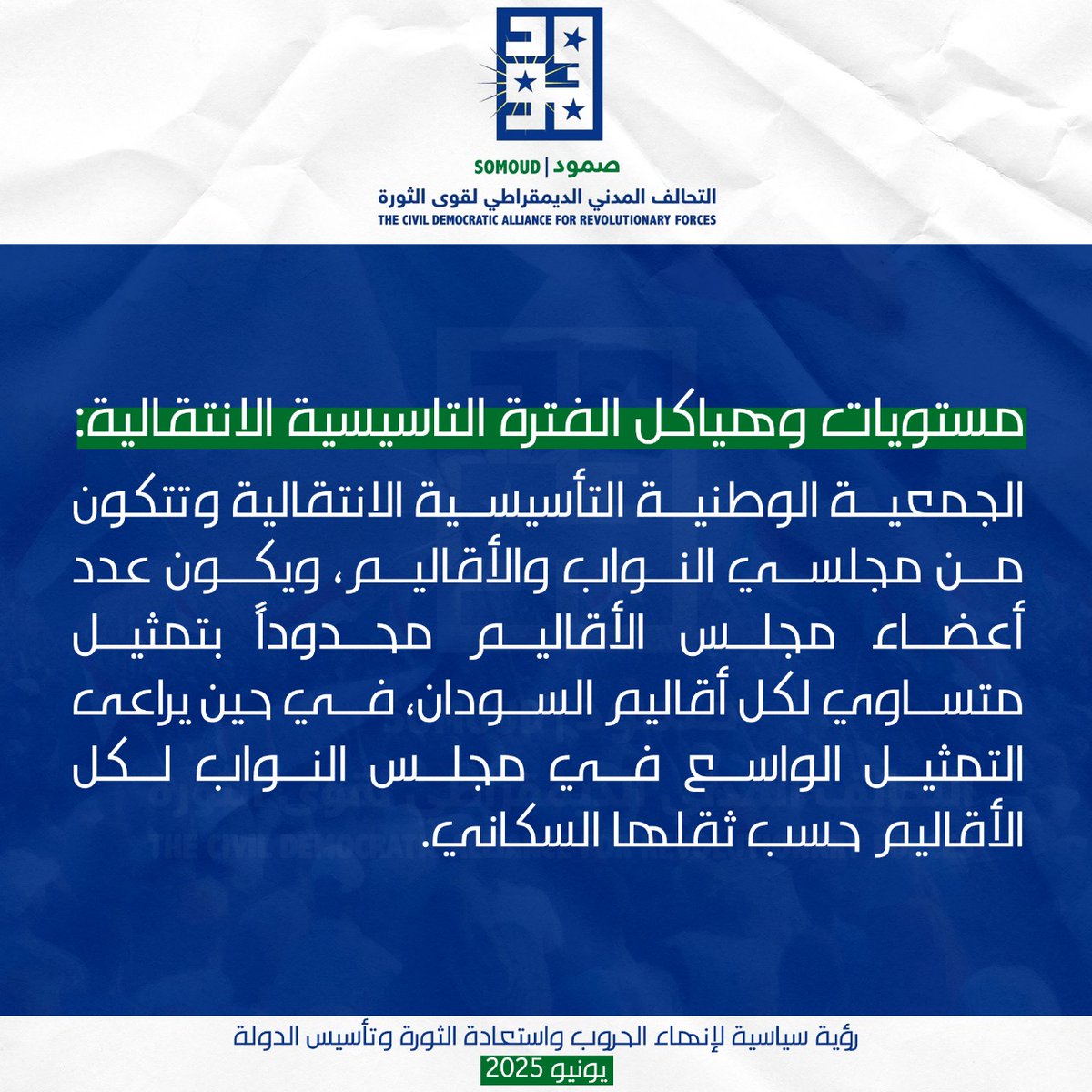 الجمعية الوطنية التأسيسية الانتقالية وتتكون من مجلسي النواب والأقاليم، ويكون عدد أعضاء مجلس الأقاليم محدوداً بتمثيل متساوي لكل أقاليم السودان، في حين يراعى التمثيل الواسع في مجلس النواب لكل الأقاليم حسب ثقلها السكاني.