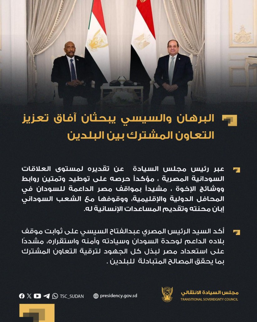 مجلس السيادة البرهان والسيسي يبحثان آفاق تعزيز التعاون المشترك بين البلدين القاهرة ٣٠-٦-٢٠٢… By null Published July 30, 2025 Share SHARE Facebook Twitter Pinterest LinkedIn[ad_1] ⭕️ البرهان والسيسي يبحثان آفاق تعزيز التعاون المشترك بين البلدين القاهرة ٣٠-٦-٢٠٢٥م [ad_2] Source by مجلس السيادة الإنتقالي – السودان Facebook Twitter Pinterest LinkedIn Share This Article Facebook Twitter Email Print Previous Article وجهود توسيع الحد من الظواهر السالبة، وتعزيز الجوانب الإيجابية في المجتمع حيث أشد… Next Article واحد من أبرز رموز الحزب الجمهوري الأميركي، السيناتور تيد كروز ، الرجل الذي نافس … Leave a Comment Leave a Reply Cancel replyYour email address will not be published. Required fields are marked *Comment * Name * Email * Website Save my name, email, and website in this browser for the next time I comment. Δ SearchSearchRecent Postsأكرمنا الله صباح اليوم الأحد بلقاء إخوةٍ كرام، على ضفة النيل الأزرق، حيث شاي الش… أعلن بنك السودان المركزي في منشور إدارة السياسات رقم (2025/15) رفع الاحتكار عن ا… ندوة بعنوان: القانون الدولي والسيادة الوطنية قراءة في موقف السودان من لجنة تقصي … والي نهر النيل تستقبل وزير الموارد البشرية والرعاية الاجتماعية الوزير يشيد بالأ… كامل ادريس: رئيس اللجنة السياسية لمؤسسات الدولة السودانية. Recent CommentsNo comments to show.