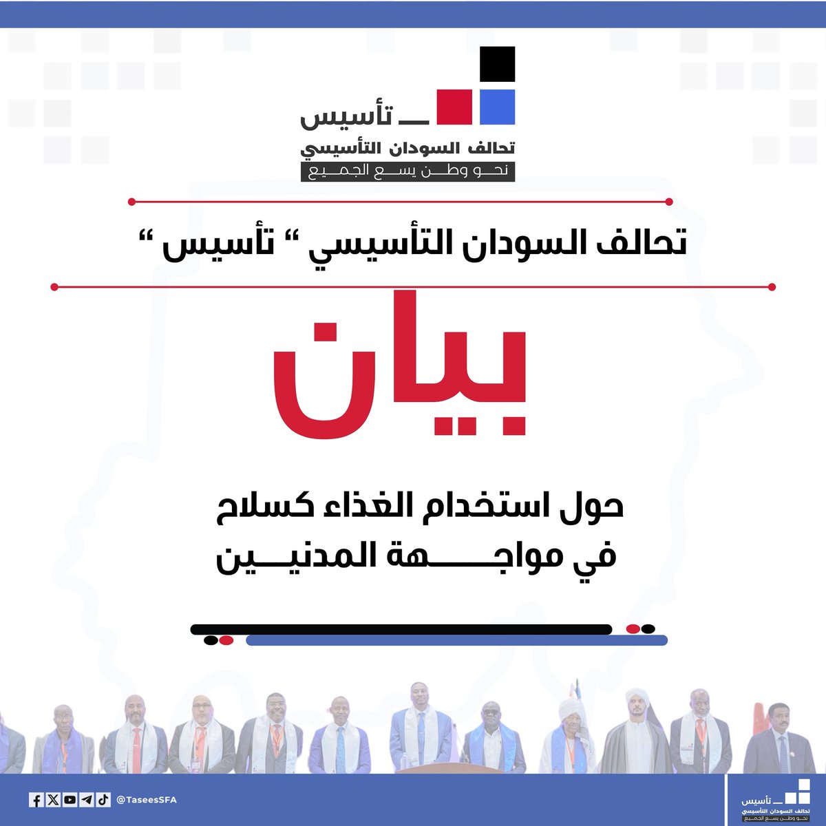 وإذ يدين تحالف السودان التأسيسي هذا السلوك، فإنه يدعو كل السودانيين والمجتمع الدولي والإقليمي إلى اتخاذ خطوات عملية ضد سلطة الحركة الإسلامية لاستخدامها الغذاء كسلاح في مواجهة المدنيين، وهي جريمة ضد الإنسانية ومحرمة في القانون الدولي الإنساني.