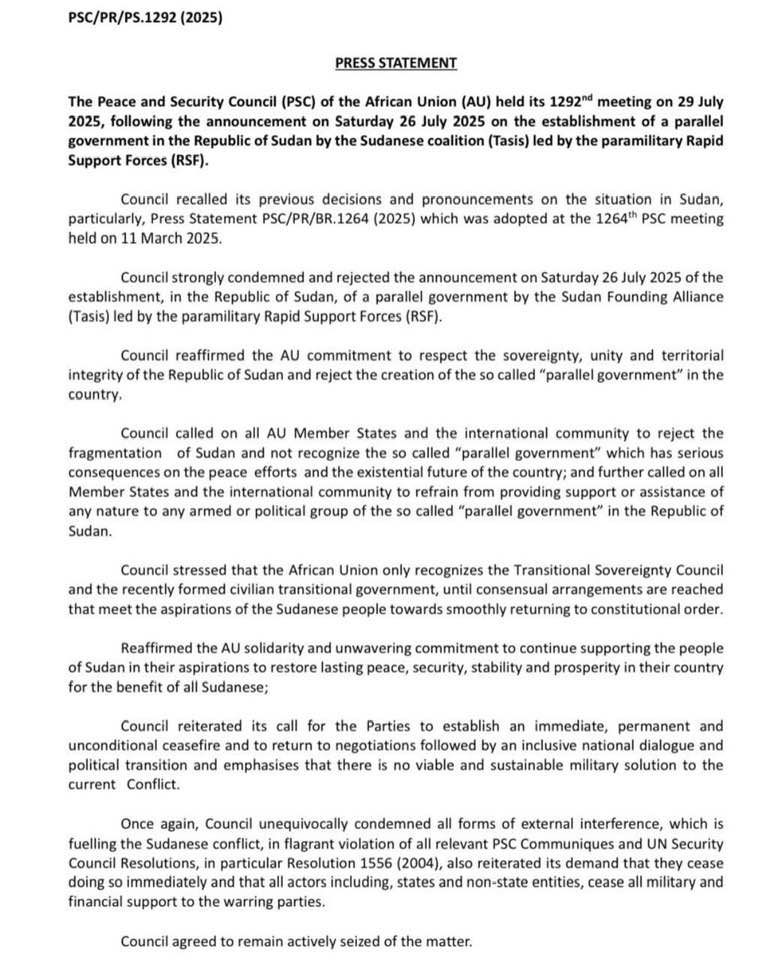 مجلس السلم والأمن الإفريقي يصدر بياناً يدين ويرفض فيه قيام حكومة موازية بواسطة (تأسيس) والدعm الsريع ويؤكد اعتراف الاتحاد الإفريقي بمجلس السيادة الانتقالي و(الحكومة الانتقالية المدنية) المُشكلة حديثاً إلى حين قيام إجراءات متوافق عليها تلبي طموحات الشعب السوداني.. (نهدي البيان لمن كانوا يتشدقون بالحديث عن عدم اعتراف الاتحاد الإفريقي بحكومة السودان)!
