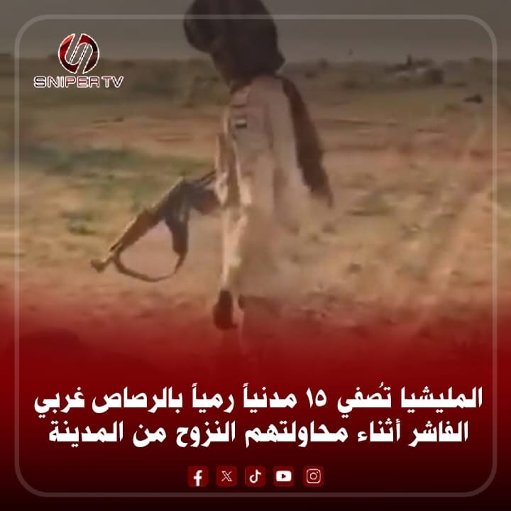 نادر البدوي المليشيا تُصفي 15 مدنياً رمياً بالرصاص غربي الفاشر أثناء محاولتهم النزوح من المد… By null Published August 3, 2025 Share SHARE Facebook Twitter Pinterest LinkedIn[ad_1] المليشيا تُصفي 15 مدنياً رمياً بالرصاص غربي الفاشر أثناء محاولتهم النزوح من المدينة. [ad_2] Source Facebook Twitter Pinterest LinkedIn Share This Article Facebook Twitter Email Print Previous Article رحم الله شهداء درع السودان وجميع شهداء معركة الكرامة، وشفى الجرحى وفك قيد الأسرى… Next Article صباح اليوم.. قصف مدفعي عنيف من قبل مليشيا الدعم السريع على أحياء مدينة الفاشر ب… Leave a Comment Leave a Reply Cancel replyYour email address will not be published. Required fields are marked *Comment * Name * Email * Website Save my name, email, and website in this browser for the next time I comment. Δ SearchSearchRecent Postsأكرمنا الله صباح اليوم الأحد بلقاء إخوةٍ كرام، على ضفة النيل الأزرق، حيث شاي الش… أعلن بنك السودان المركزي في منشور إدارة السياسات رقم (2025/15) رفع الاحتكار عن ا… ندوة بعنوان: القانون الدولي والسيادة الوطنية قراءة في موقف السودان من لجنة تقصي … والي نهر النيل تستقبل وزير الموارد البشرية والرعاية الاجتماعية الوزير يشيد بالأ… كامل ادريس: رئيس اللجنة السياسية لمؤسسات الدولة السودانية. Recent CommentsNo comments to show.