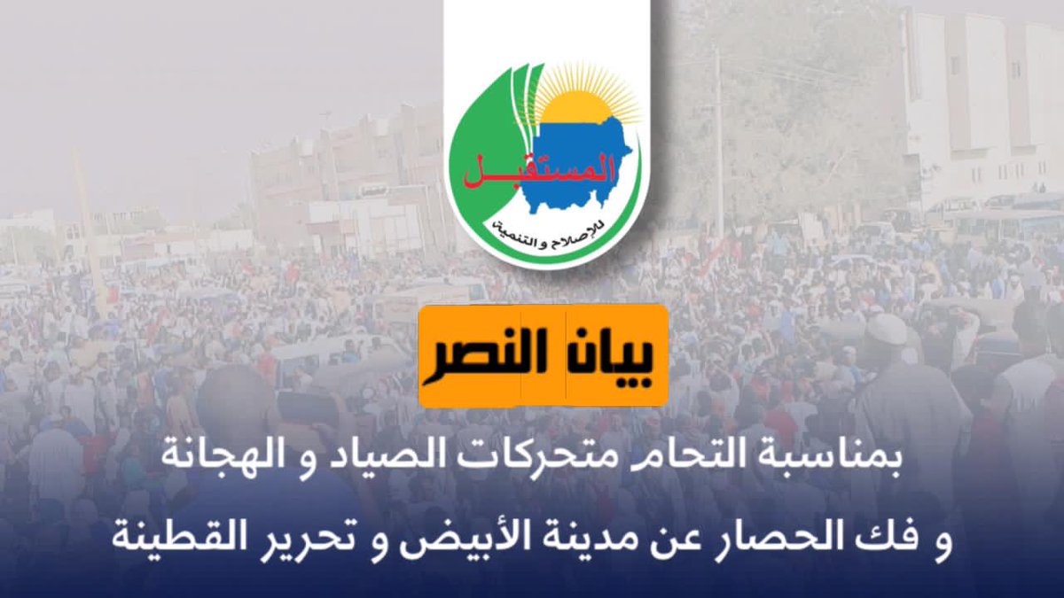 يهنئ حزب حركة المستقبل للإصلاح و التنمية الأمة السودانية و قواتها المسلحة بمناسبة التقاء متحركات الشهيد الصياد و الشهيد المصري مع قوات الفرقة الخامسة مشاة بمدينة الأبيض وإعلان فك الحصار عن مدينة الأبيض، كما تمتد التهنئة أيضا بتحرير مدينة القطينة بولاية النيل الأبيض و التقدم في محاور وسط الخرطوم .