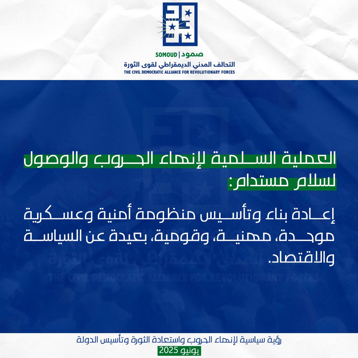 العملية السلمية لإنهاء الحروب والوصول لسلام مستدام: إعادة بناء وتأسيس منظومة أمنية وعسكرية موحدة، مهنية، وقومية، بعيدة عن السياسة والاقتصاد.