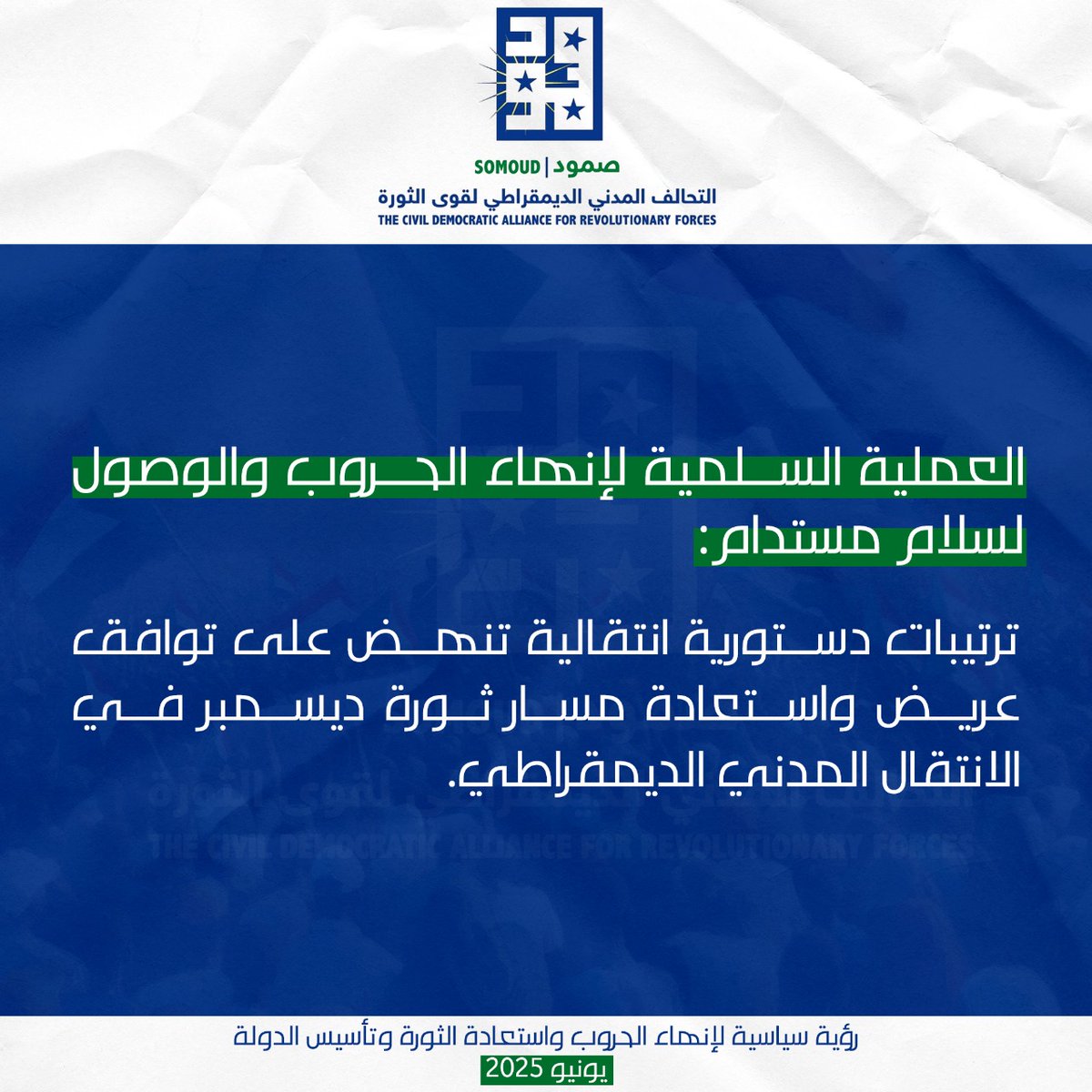 العملية السلمية لإنهاء الحروب والوصول لسلام مستدام: ترتيبات دستورية انتقالية تنهض على توافق عريض واستعادة مسار ثورة ديسمبر في الانتقال المدني الديمقراطي.