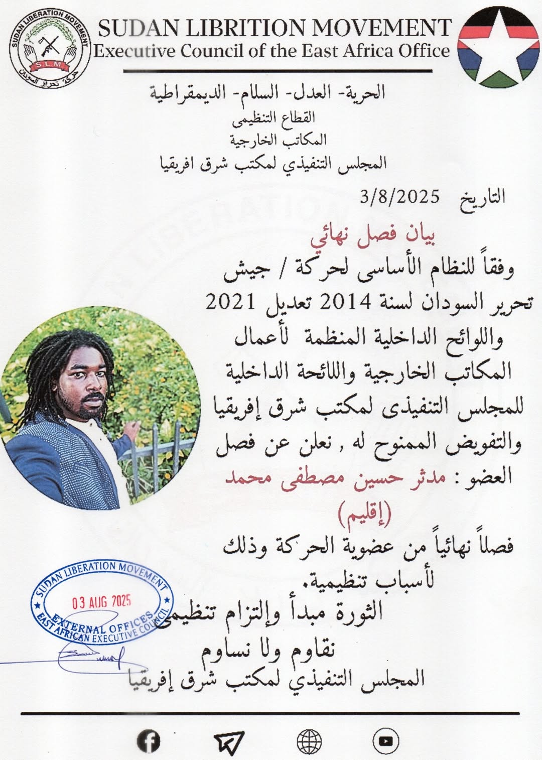 حركة جيش تحرير السودان بيان فصل نهائي من عضوية حركة/ جيش تحرير السودان By null Published August 4, 2025 Share SHARE Facebook Twitter Pinterest LinkedIn[ad_1] بيان فصل نهائي من عضوية حركة/ جيش تحرير السودان [ad_2] Source Facebook Twitter Pinterest LinkedIn Share This Article Facebook Twitter Email Print Previous Article هؤلاء مرتزقة من كولومبيا، وأمريكا الجنوبية، وليبيا، وتشاد، يقاتلون في صفوف ميليش… Next Article \u0631\u0626\u064a\u0633 \u0645\u062c\u0644\u0633 \u0627\u0644\u0633\u064a\u0627… Leave a Comment Leave a Reply Cancel replyYour email address will not be published. Required fields are marked *Comment * Name * Email * Website Save my name, email, and website in this browser for the next time I comment. Δ SearchSearchRecent Postsأكرمنا الله صباح اليوم الأحد بلقاء إخوةٍ كرام، على ضفة النيل الأزرق، حيث شاي الش… أعلن بنك السودان المركزي في منشور إدارة السياسات رقم (2025/15) رفع الاحتكار عن ا… ندوة بعنوان: القانون الدولي والسيادة الوطنية قراءة في موقف السودان من لجنة تقصي … والي نهر النيل تستقبل وزير الموارد البشرية والرعاية الاجتماعية الوزير يشيد بالأ… كامل ادريس: رئيس اللجنة السياسية لمؤسسات الدولة السودانية. Recent CommentsNo comments to show.